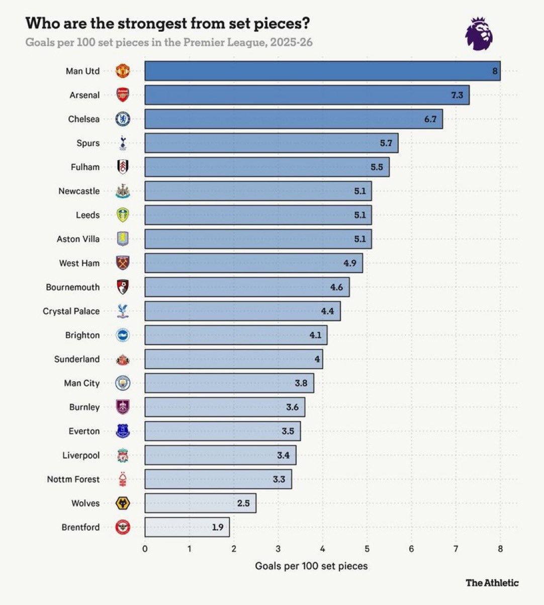 📊 Жодна команда не забила більше голів у перерахунку на 100 стандартних положень, ніж «Манчестер Юнайтед» цього сезону АПЛ.