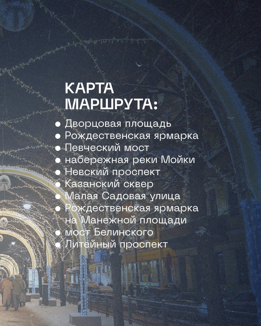 Пешеходный праздничный маршрут №4 посвящен рождественским ярмаркам. Он начинается на Дворцовой площади и через Малую и Большую Конюшенные приводит вас на Манежную площадь. Там находится ярмарка, оформленная в русском стиле, а еще там же можно покататься на коньках на новогоднем катке. Он работает ежедневно с 12:30 до 20:10.