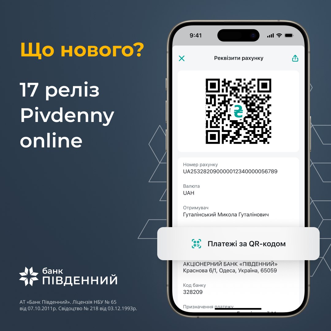 🔔 Представляємо нові можливості в мобільному застосунку Pivdenny Online, які зроблять ваші платежі та обмін реквізитами максимально швидкими та простими: