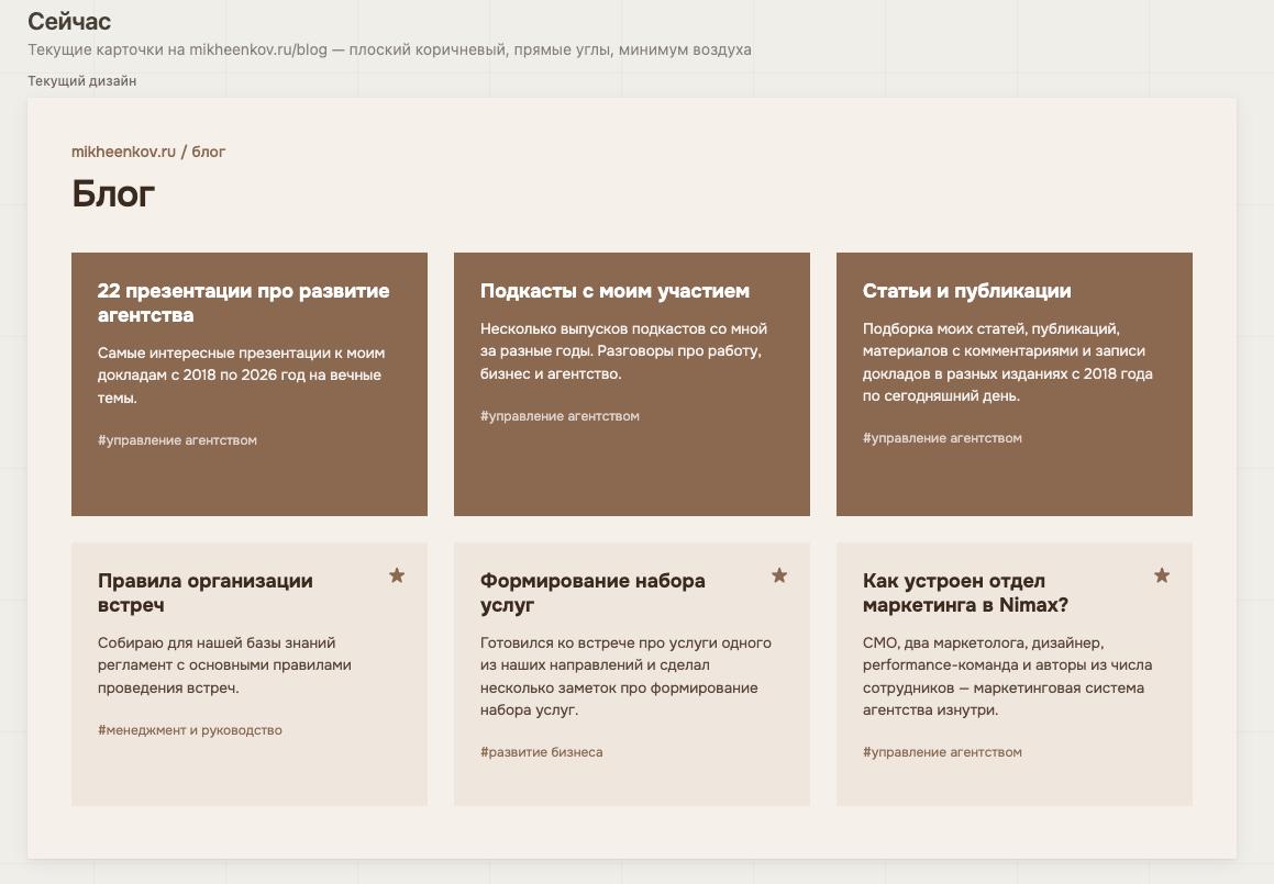 В качестве картинки приложу простейший пример визуальной работы Claude Design. Стояла задача из моих топорных карточек в блоге сделать современные.