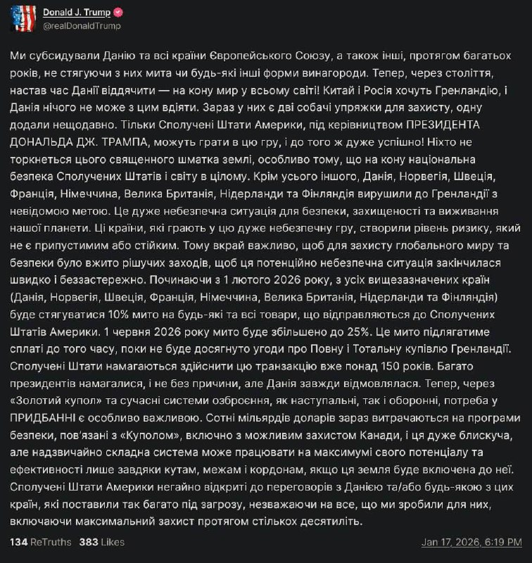 Як пише німецьке видання Die Welt, таку можливість допустив зовнішньополітичний представник фракції ХДС/ХСС Юрген Гардт, близький соратник Фредеріка Мерца. За його словами, відмова від участі в турнірі може стати "останнім аргументом", якщо США підуть на силове приєднання Гренландії. Цей крок, за задумом, має змусити Дональда Трампа переглянути позицію з гренландського питання.