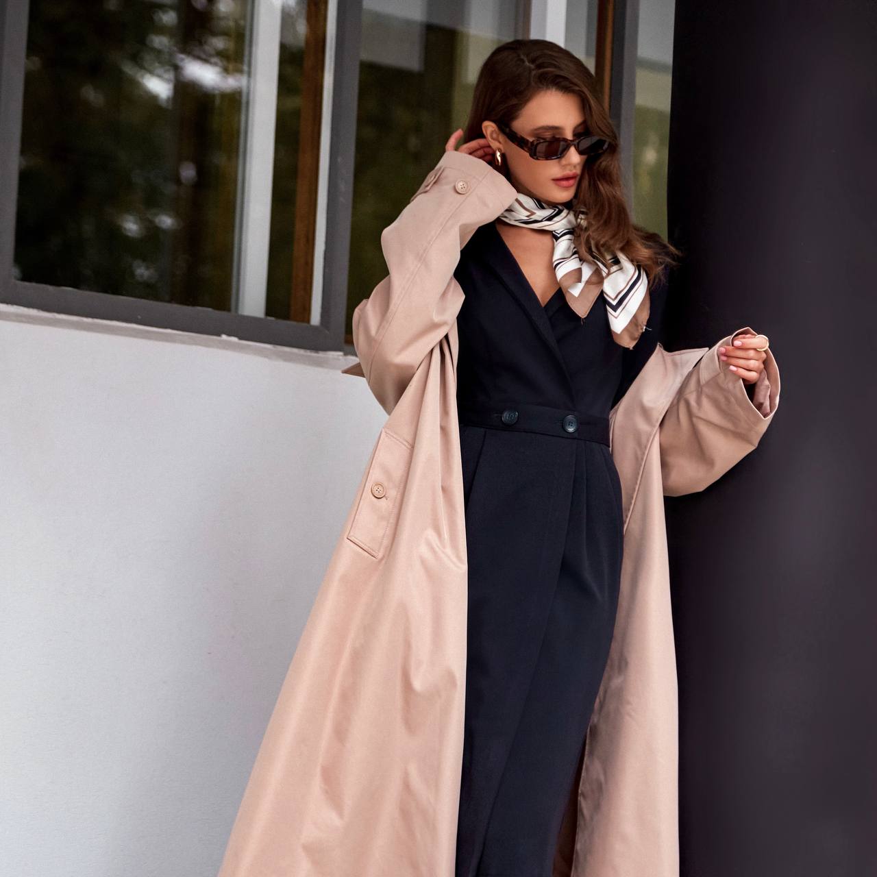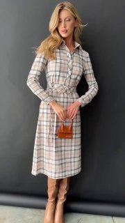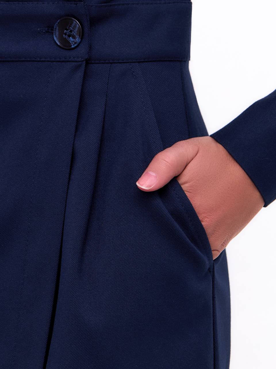 ▪Английский воротник, рельеф, запах фиксируется пуговицами (есть дополнительная потайная пуговица внутри на поясе), длинный рукав на манжете, длина юбки 75см, складки на юбке спереди, глубокие карманы.