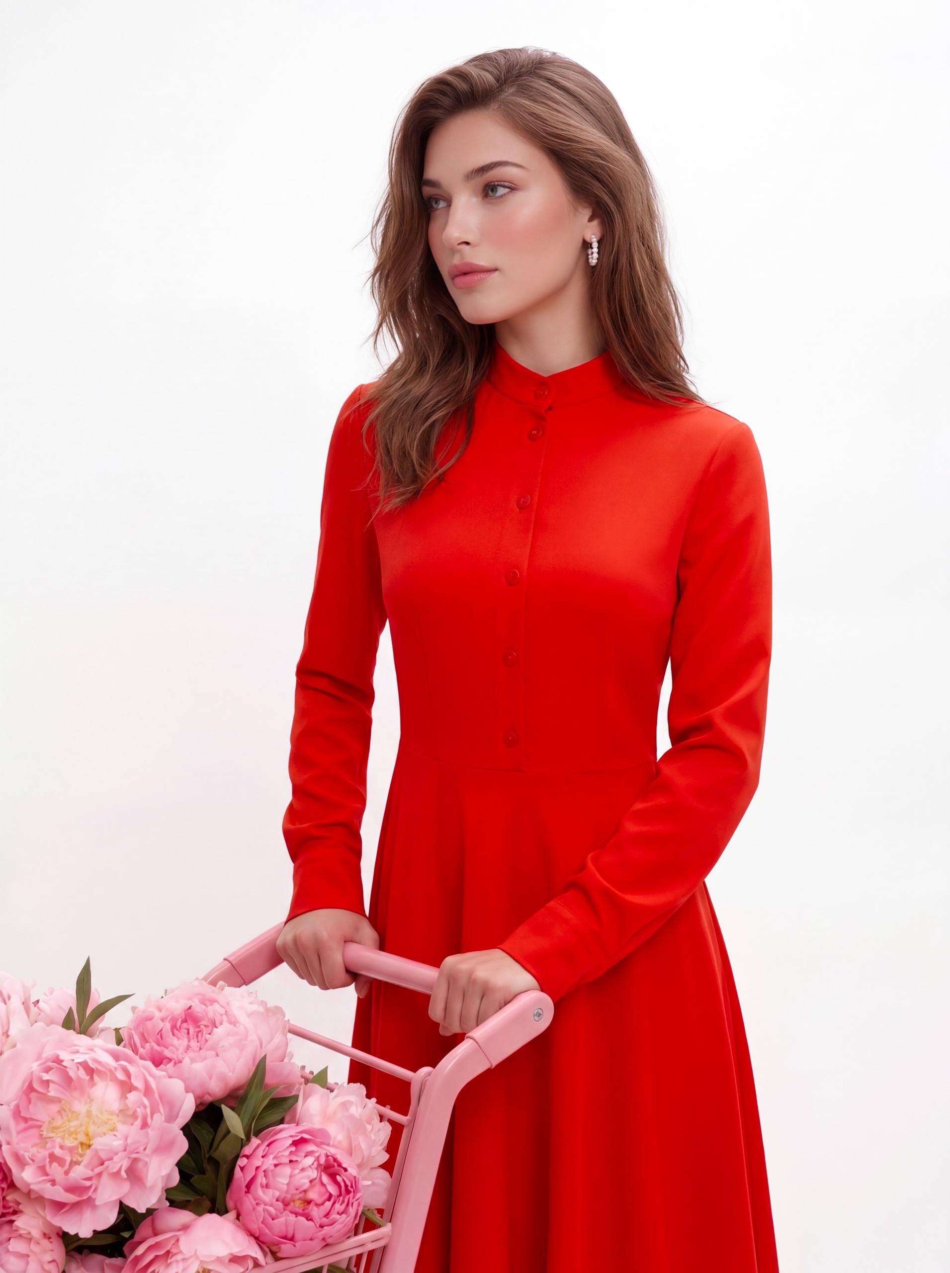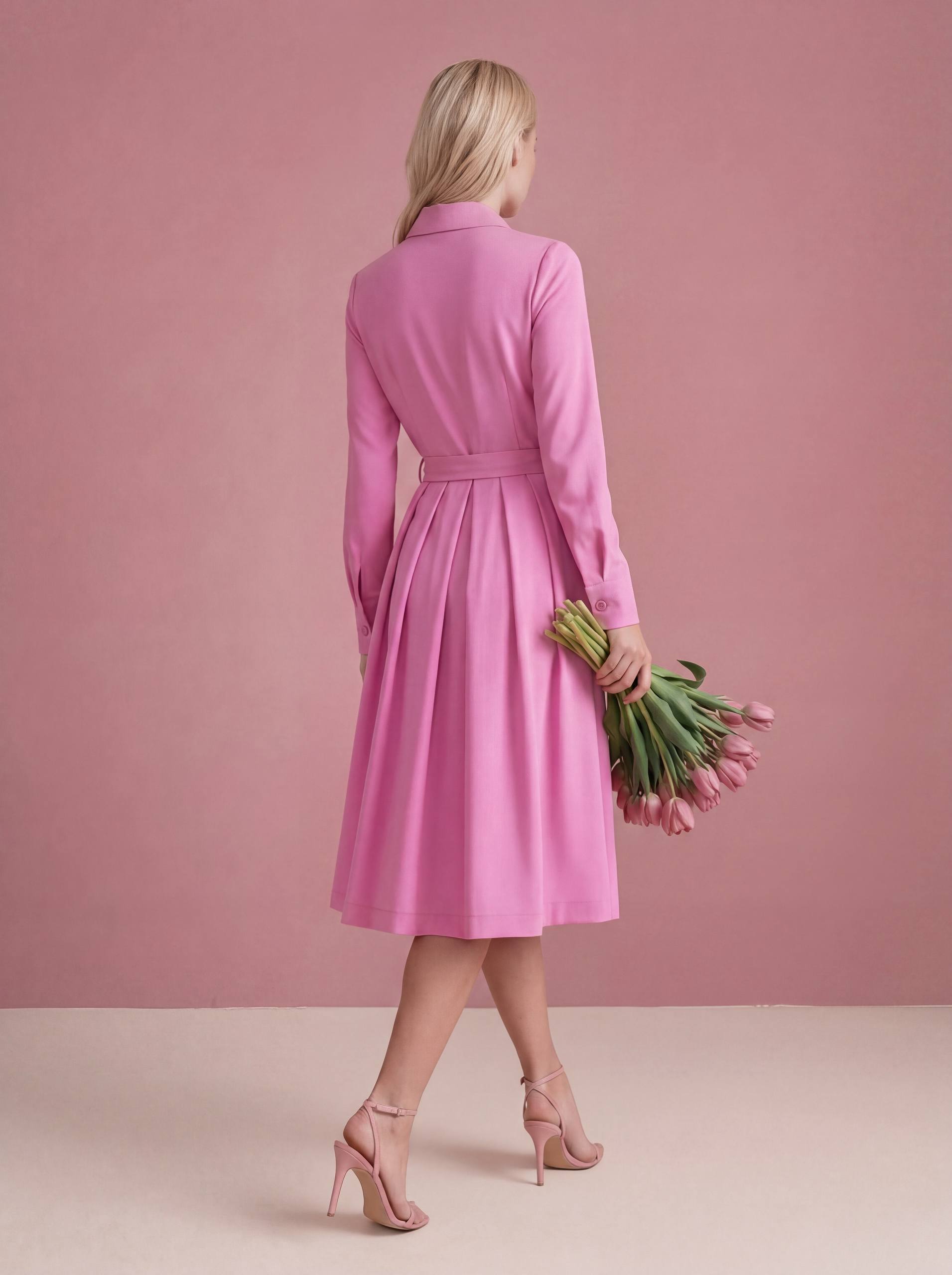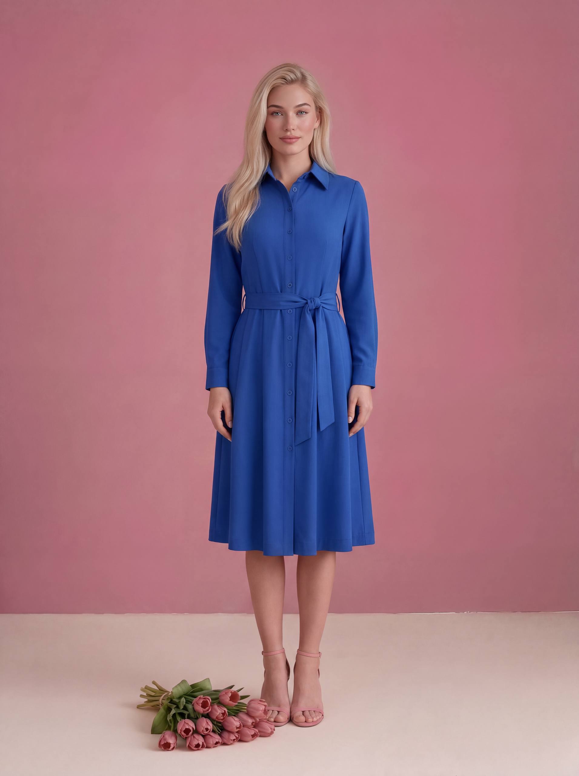 ▪Воротник отложной, пластиковые пуговицы (расстегиваются), полная длина рукава на манжете, юбка прямое полотно заложенное складками (длина юбки 70см), потайные карманы, тонкий поясок в комплекте.
