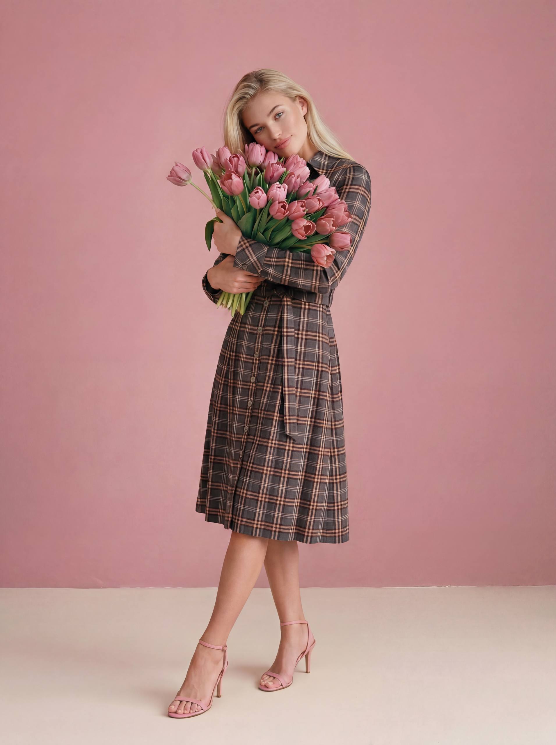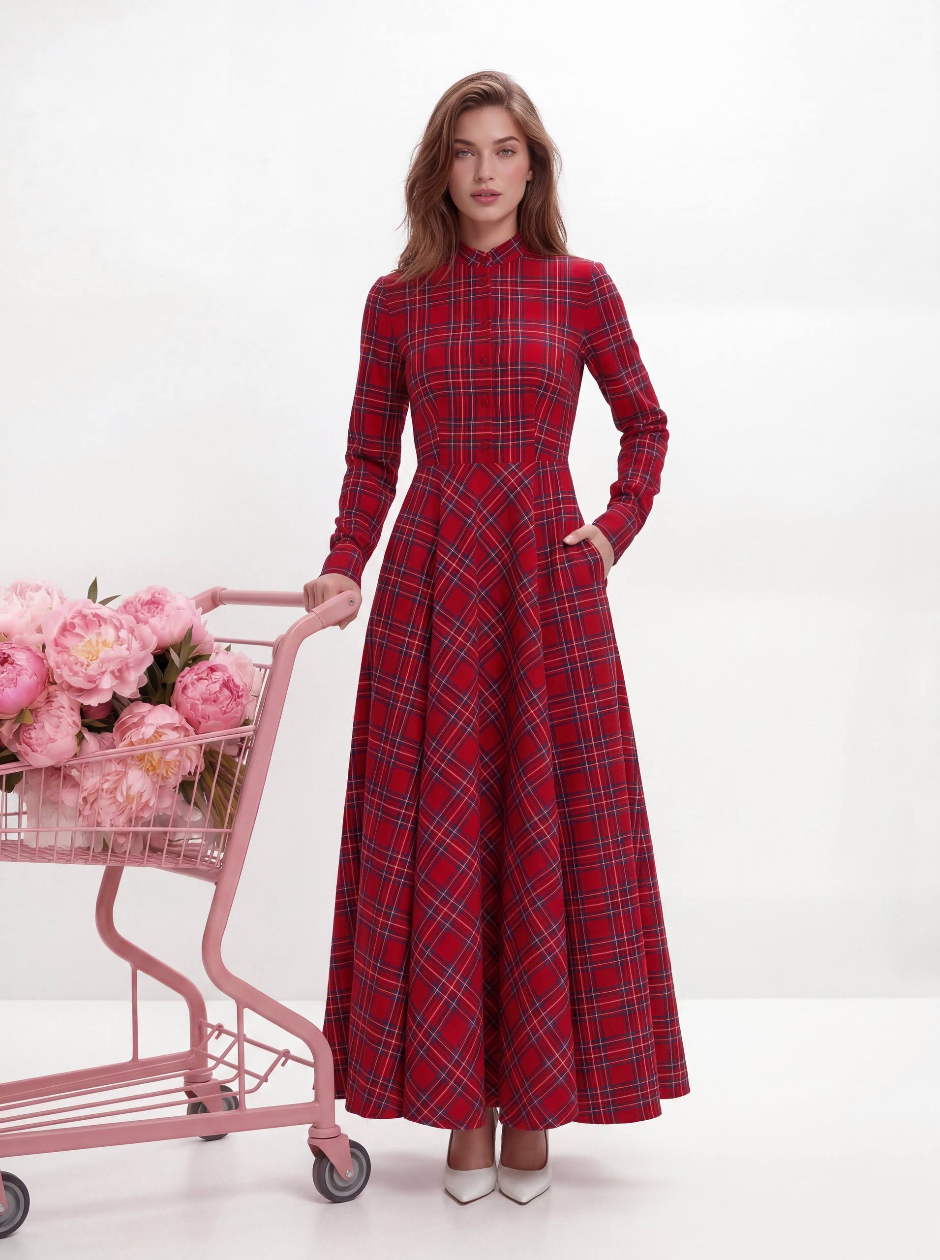 Платье в серо-бежевую клетку мягко подчеркивает фигуру, выглядит актуально и в офисе, и на встречах с подругами.