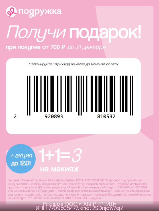 💄 Акция 1+1=3 на макияж и подарок при покупке от 700₽ в Подружке!