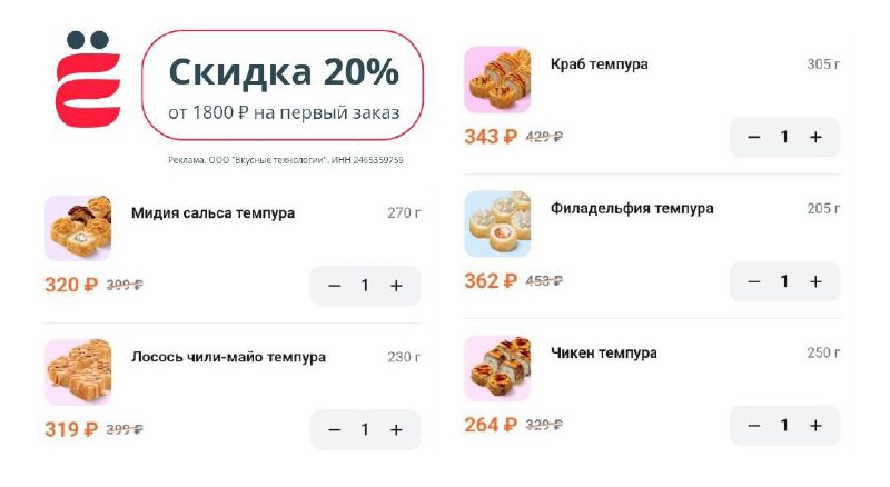 Действует только для новых клиентов и не распространяется на раздел лучшая цена без скидок, десерты, напитки