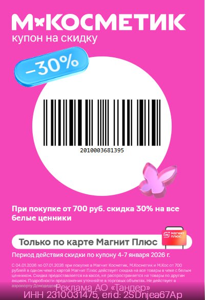 и получаем СКИДКУ 30% от 700₽ на ВСЕ товары с белыми ценниками в чеке