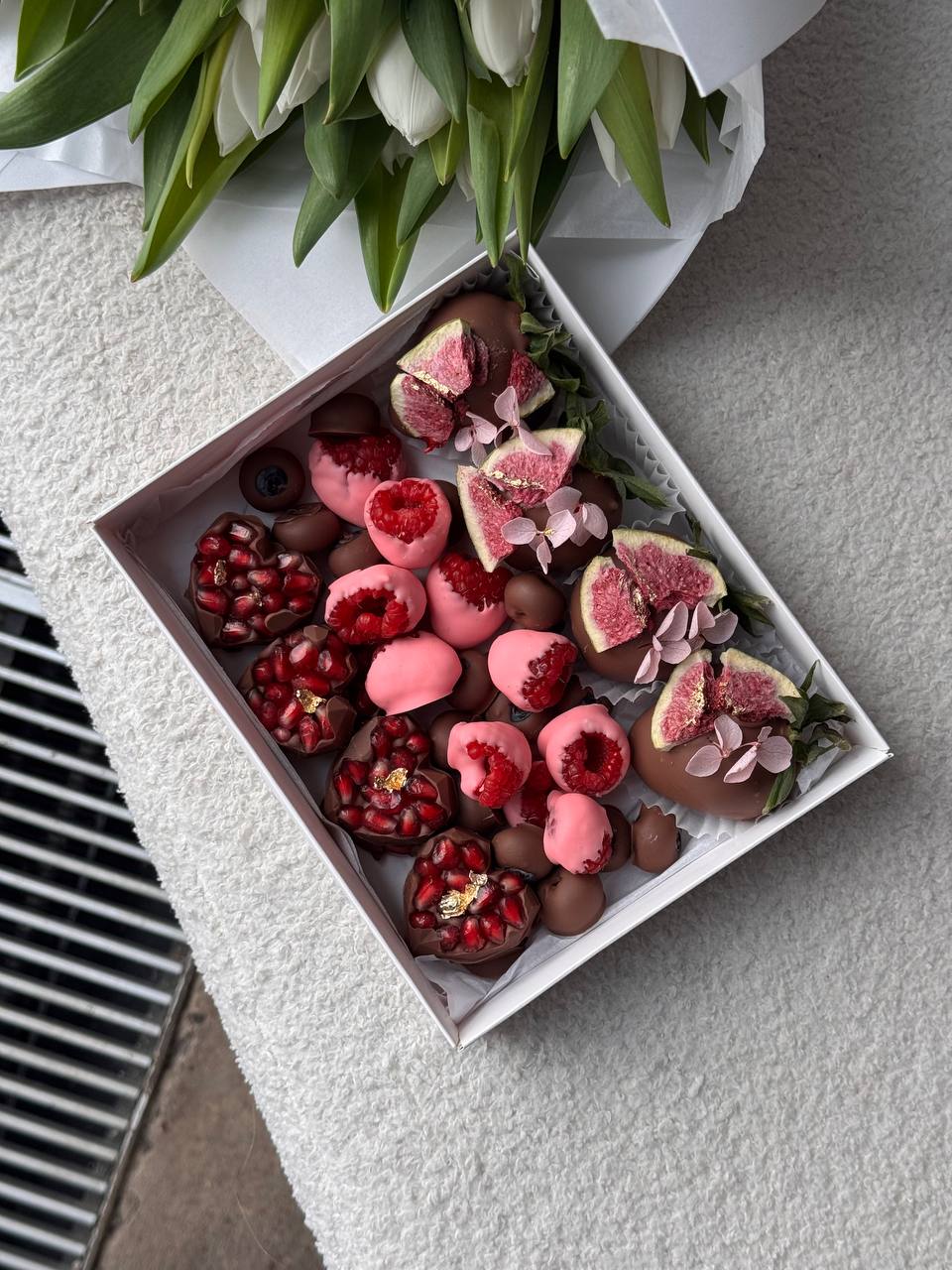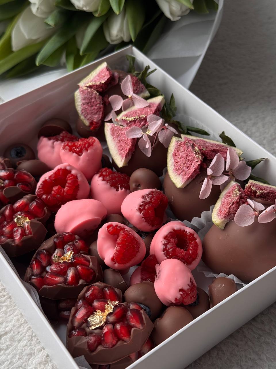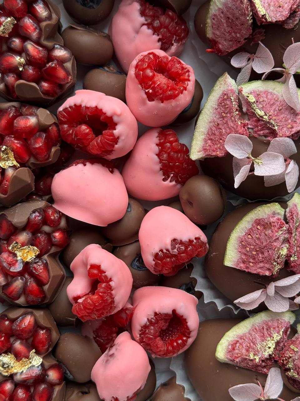 •4 клубники, 8 конфет с гранатом, 45г малины и 45г голубики в бельгийском шоколаде