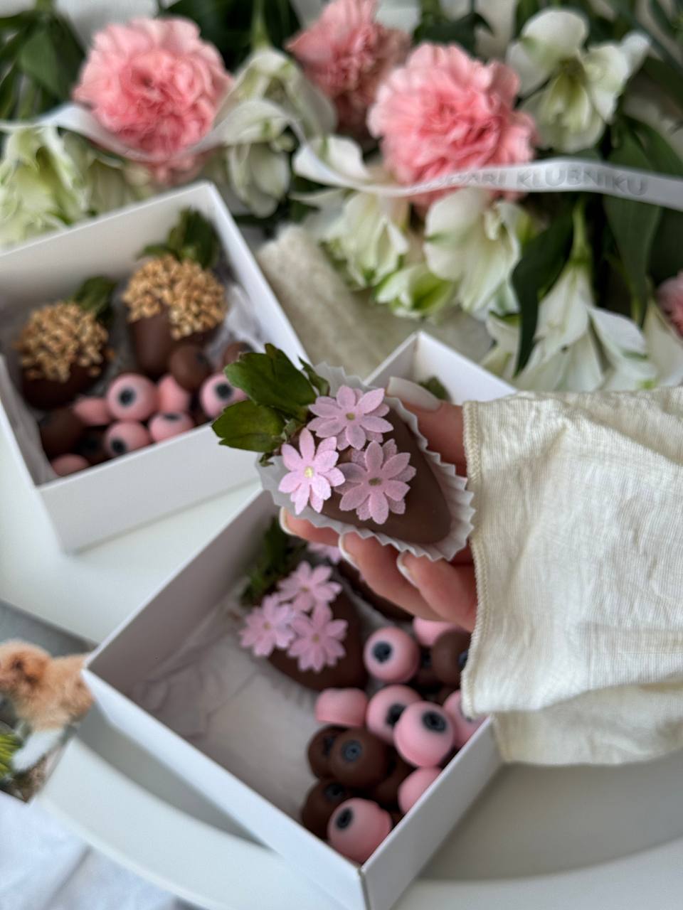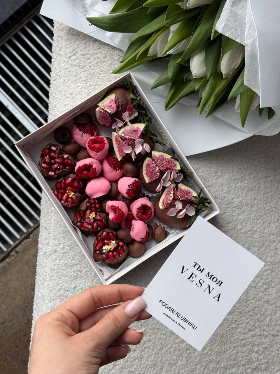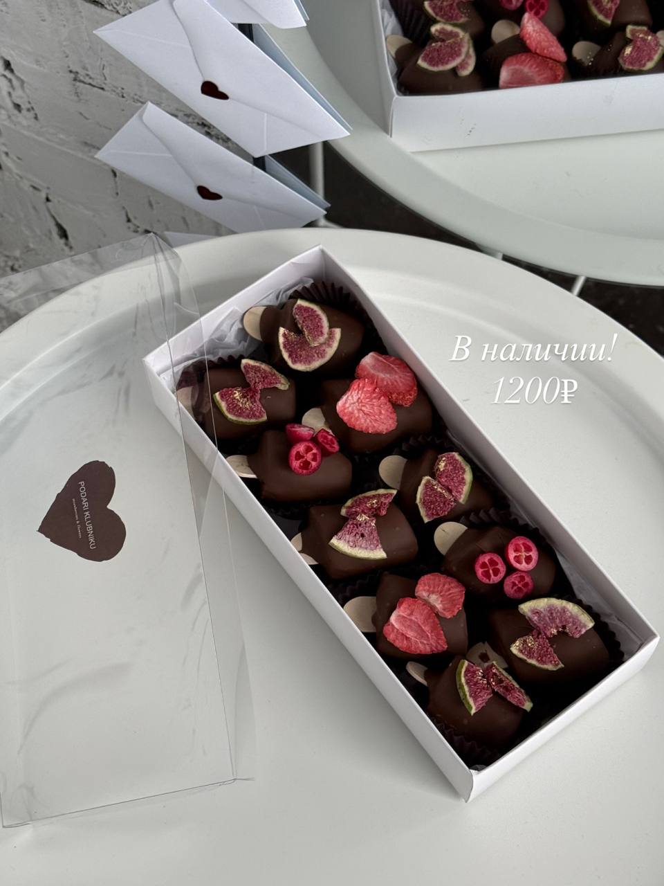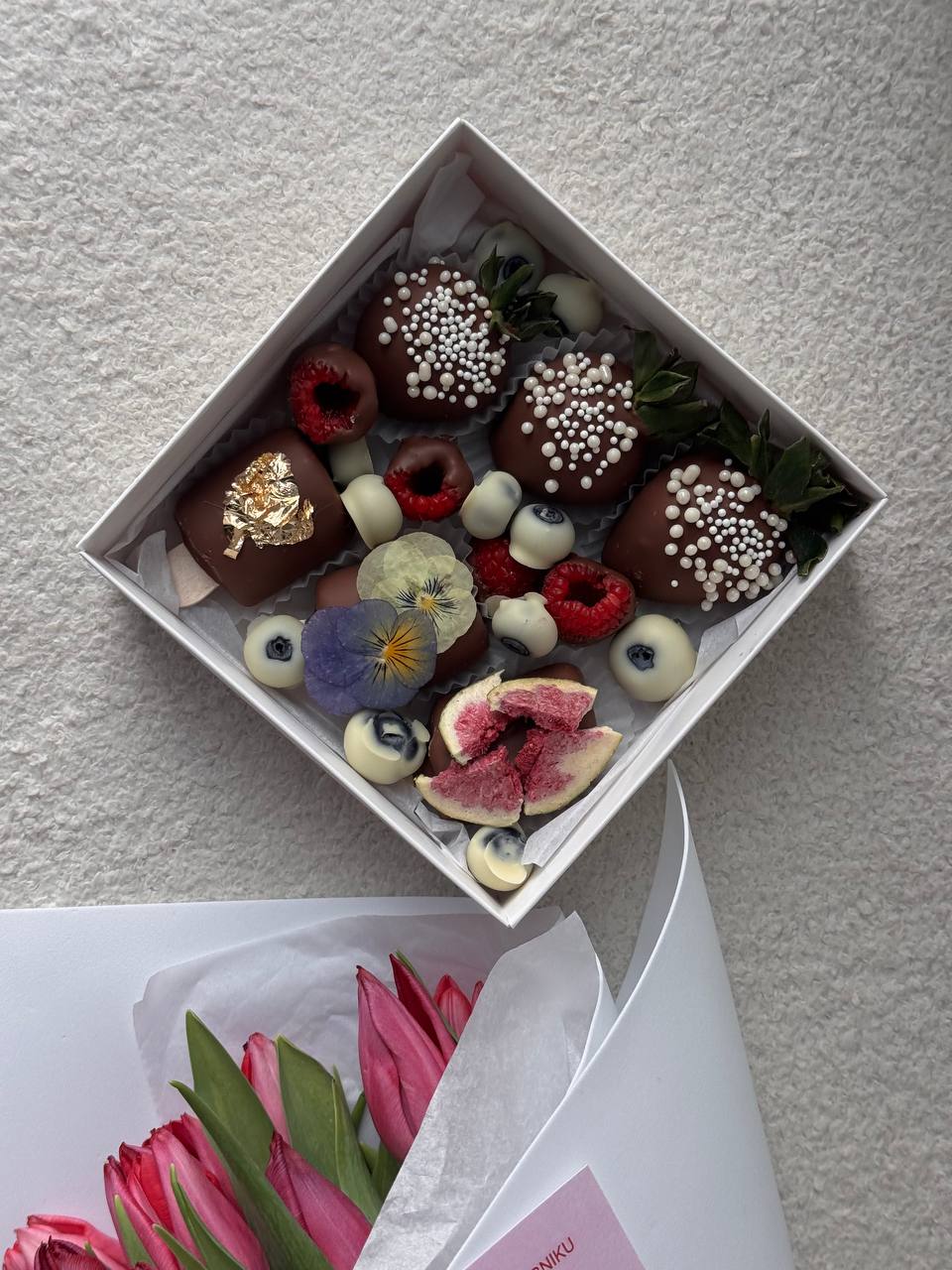 •4 клубники, 8 конфет с гранатом, 45г малины и 45г голубики в бельгийском шоколаде