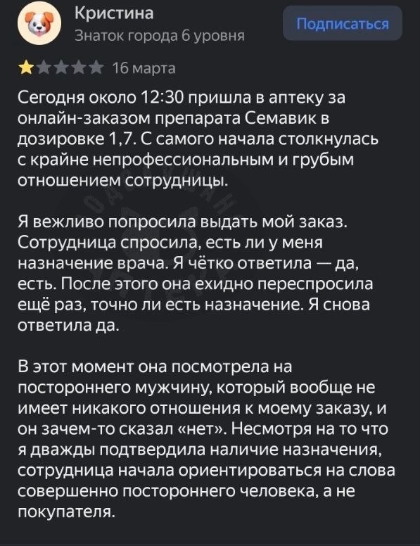 Пришла пара за заказом, а в заказе Семавик. На вопрос -«есть ли назначение?» ответила «нет». Я еще раз уточняю «точно нет назначения?». Она «нет».