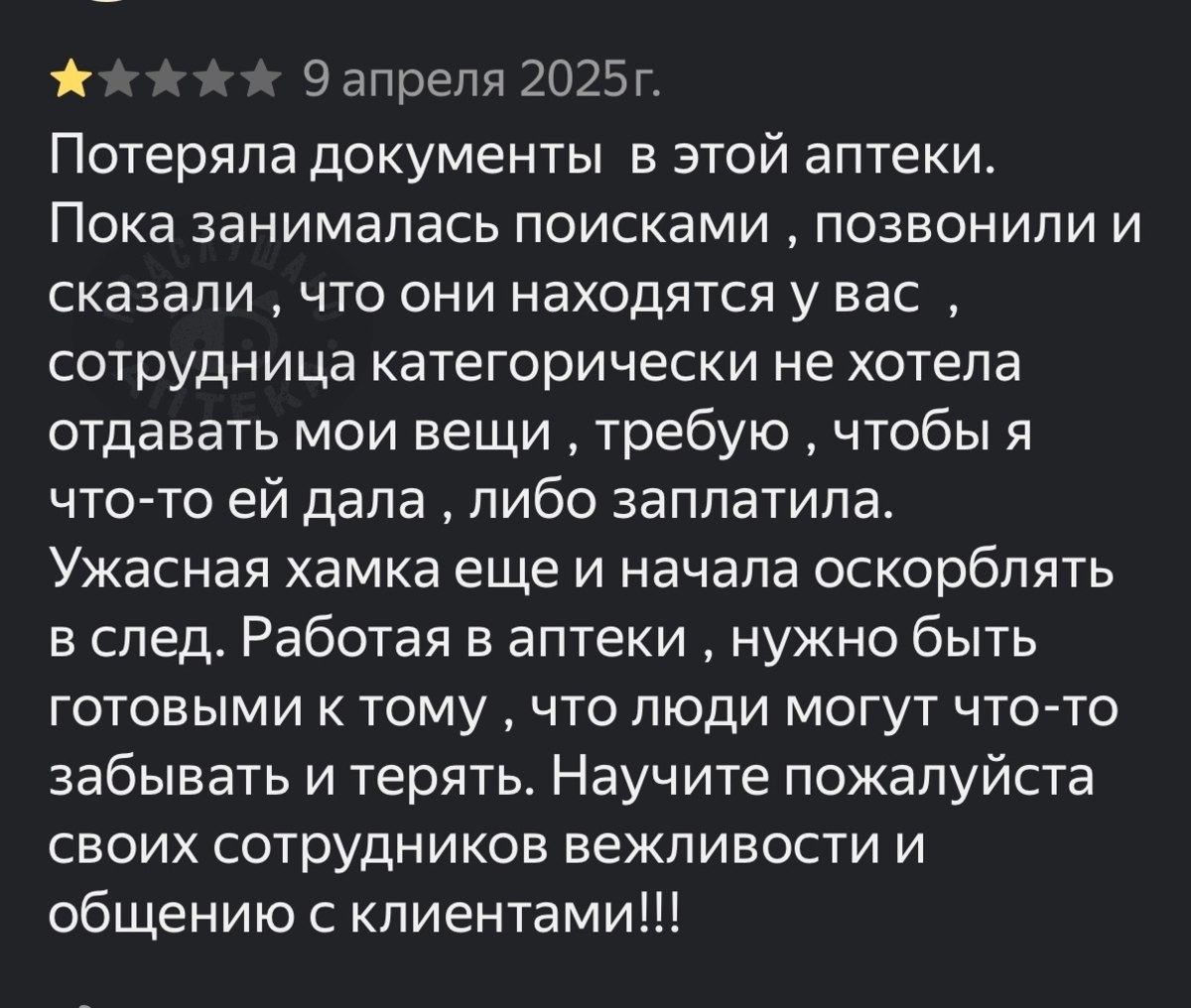 Такие шутки явно признак не профессионализма, но я был в шоке, где там можно было предположить, что аптека могла не работать. Рассудите, так ли я уж был не прав, что у меня вырвалось? К тому же, я сразу извинился, пусть это и не сработало.