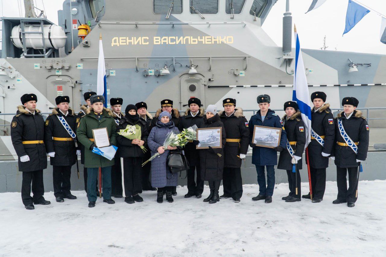 Супруге и сыновьям старшего прапорщика Дениса Васильченко вручены памятная фотография катера, флаг ВМФ и приказ Главнокомандующего Военно-Морского Флота о присвоении почётного наименования.