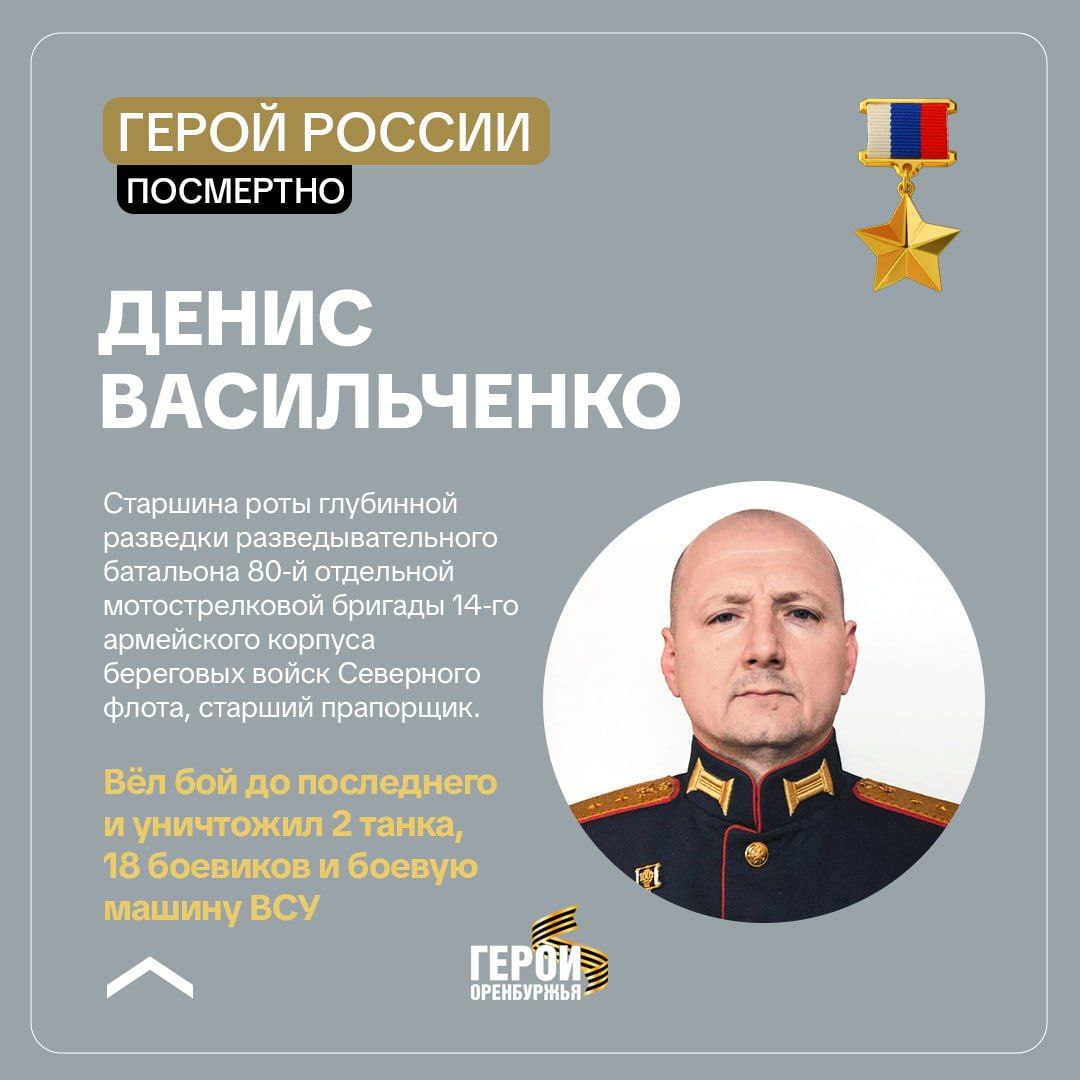Денис Васильченко родился в посёлке Ясная Поляна. С начала марта 2022 года в должности старшины разведподразделения Северного флота принимал участие в СВО, неоднократно проявлял мужество и героизм. 19 октября 2023 года воины-североморцы отражали контрнаступление превосходящих сил противника. Оренбуржец героически вступил в бой, уничтожив 2 танка и 18 боевиков. Его позицию практически в упор расстрелял вражеский танк. Из последних сил старший прапорщик Васильченко произвёл выстрел из ручного противотанкового гранатомета, выведя из строя боевую машину ВСУ. Звание Героя России бойцу присвоено посмертно.