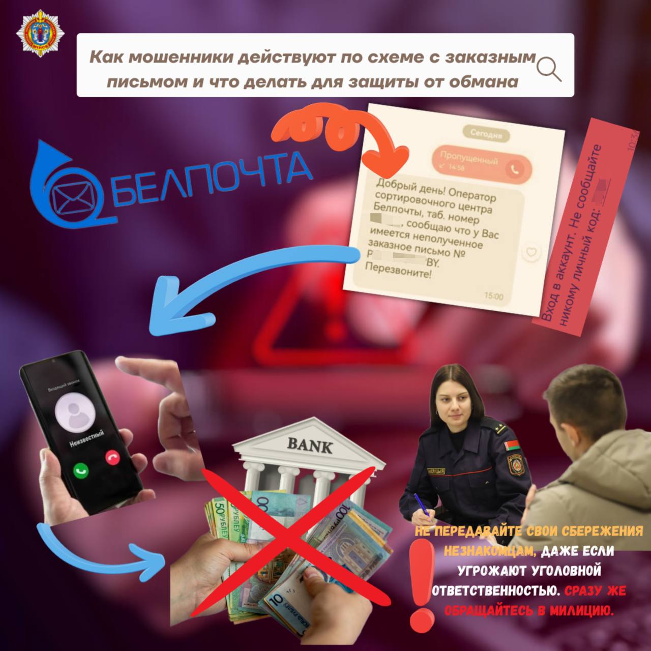 ❗️Помните: сотрудники банков, правоохранительных органов и почтовых служб не требуют переводить деньги и не просят сообщать коды из СМС. При подобных звонках или сообщениях прекратите разговор и обратитесь в милицию.