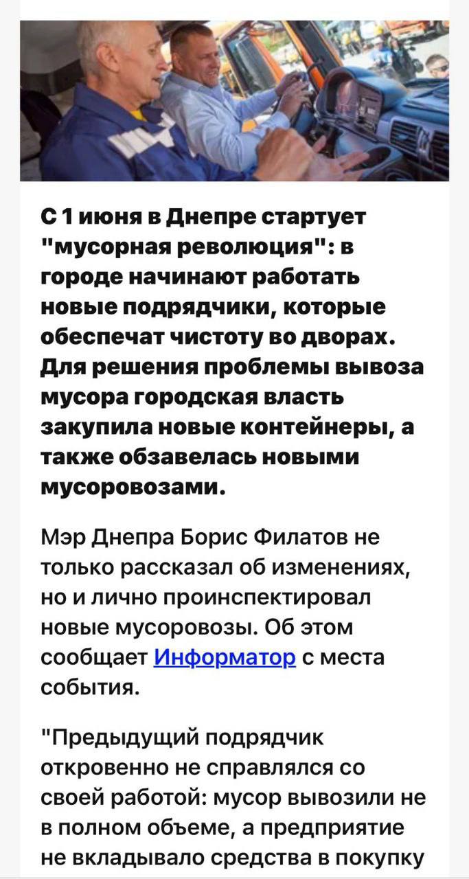 З 1 червня 2018 року Борис Філатов ініціював так звану «сміттєву реформу», що стосувалася вивезення твердих побутових відходів. Тоді було заявлено про залучення нових операторів з вивезення сміття в Дніпрі, оскільки попередні, за офіційною версією, не справлялися зі своїми обов’язками, а місто стикалося з проблемою накопичення відходів.