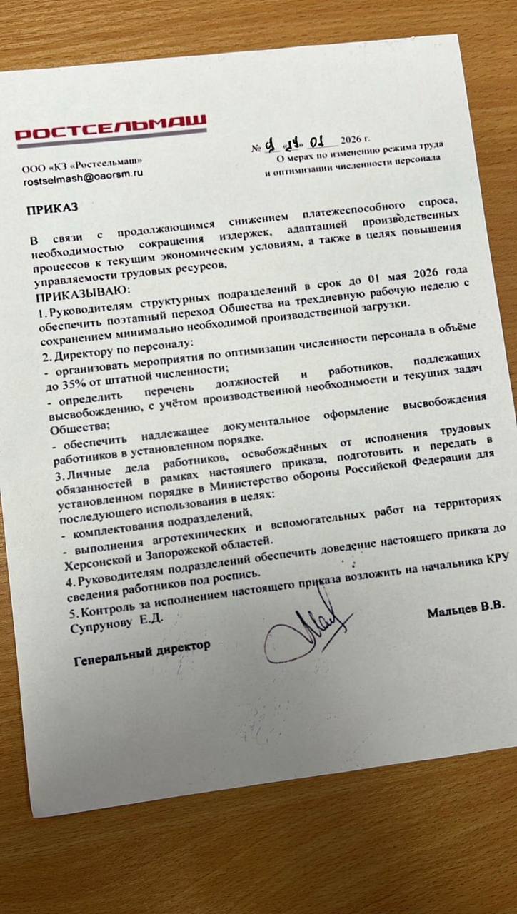 Документ за підписом керівництва "Ростсільмашу" зовні виглядає як звичайний наказ про скорочення. Але це лише обгортка. Усередині — планова утилізація працівників на користь держави, яка більше не вміє нічого робити, крім трун. Формальні причини стандартні: