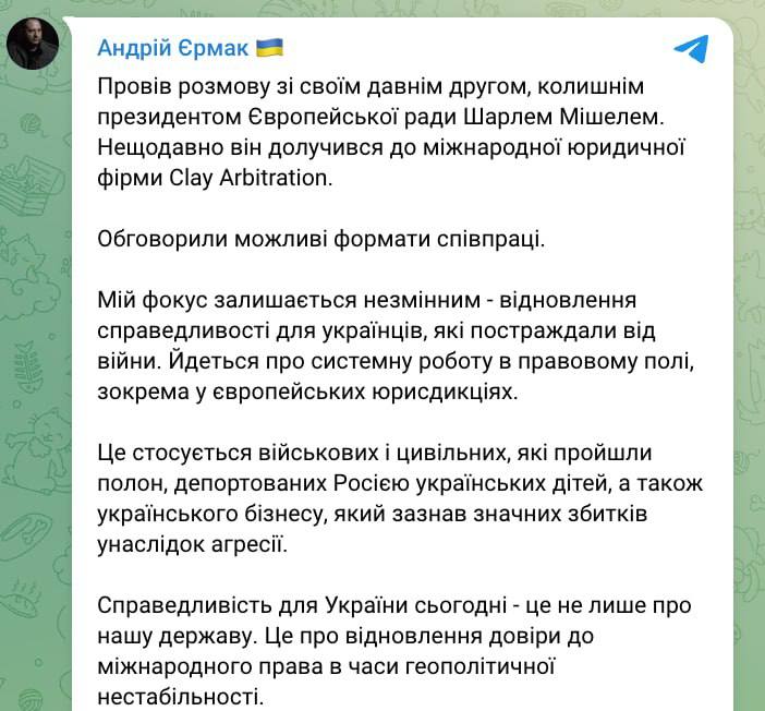 Відновлюємо справедливість для українців, які постраждали від війни. Мова про системну роботу в правовому полі, зокрема у юрисдикціях Європи, – Єрмак.