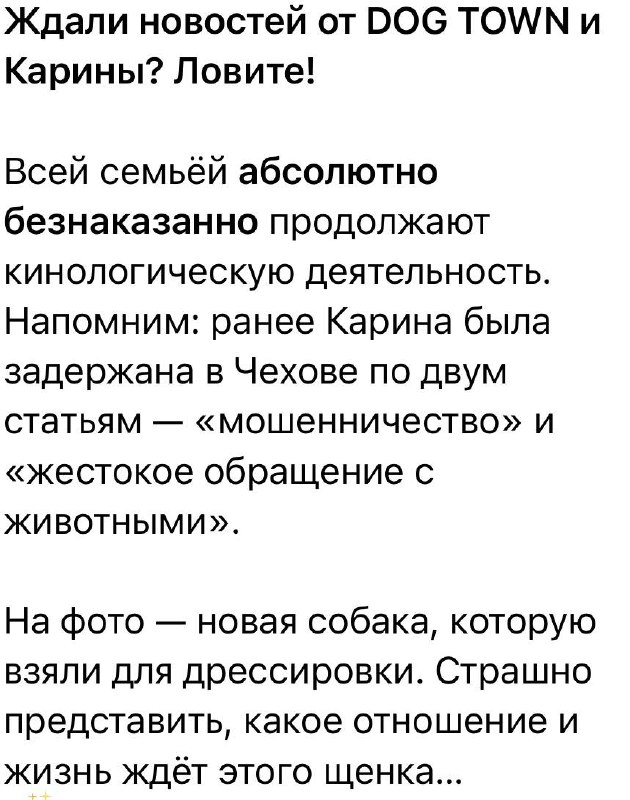 Напомним: ранее Карина была задержана в Чехове по двум статьям — «мошенничество» и «жестокое обращение с животными»⏩.