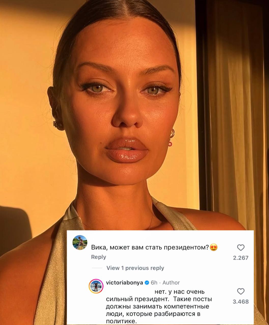 В конце Боня заявила, что интервью давать не будет, а все комментарии она уже высказала в видео. Виктория отметила, что она — за свою страну и за свой народ.