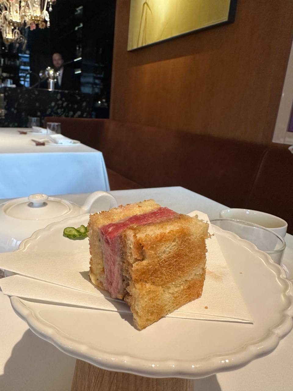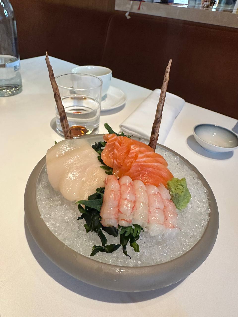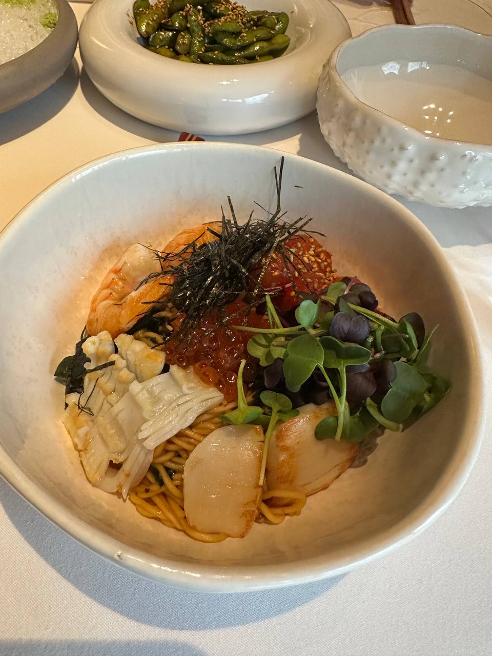 🍱Зина заказала сашими из лосося, креветки и гребешка, а также сандо с филе миньон — сочные небольшие японские сэндвичи в молочном хлебе. Сашими подавали небольшими порциями по 30 грамм — как украли. Два кусочка гребешка обошлись, например, в 1200 рублей. Люба же попробовала лапшу с морепродуктами и красной икрой — очень добротная (см фото) лапша по цене 4 кусочков гребешка. В чем логика такого ценообразования, неясно. Иногда Любе кажется, что рестораторы в сговоре с Минздравом проводят над москвичами психологические эксперименты