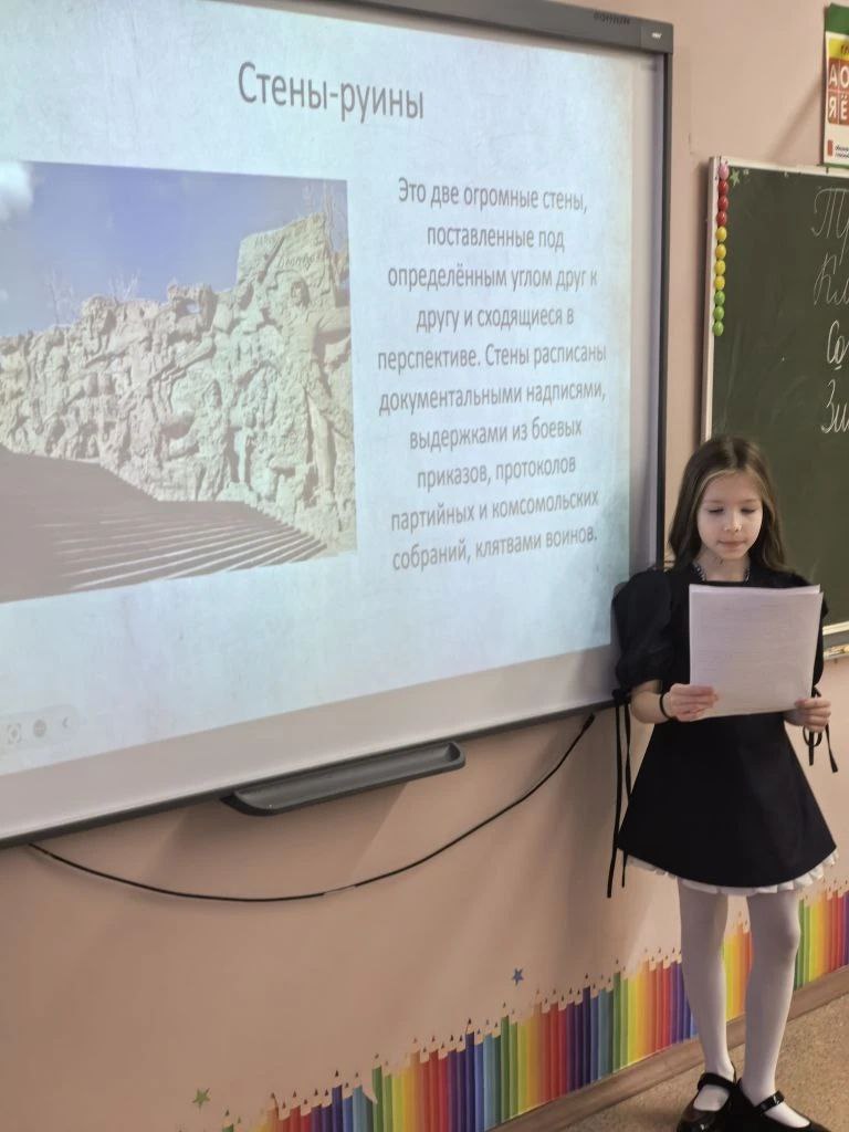 Сегодня ученица 2" Б" класса Шаповалова Евгения в классе представила проект " Памятники Мамаева кургана в Волгограде". Этот проект Евгения приготовила для конкурса Леонардо.