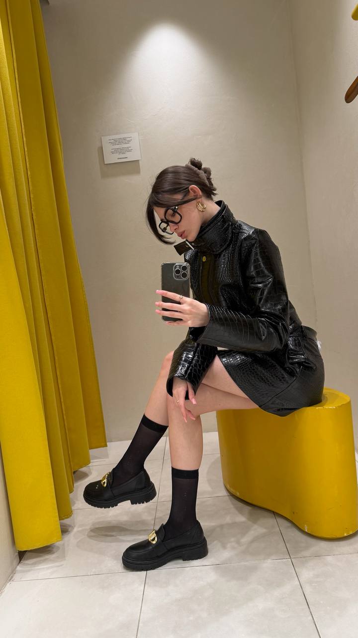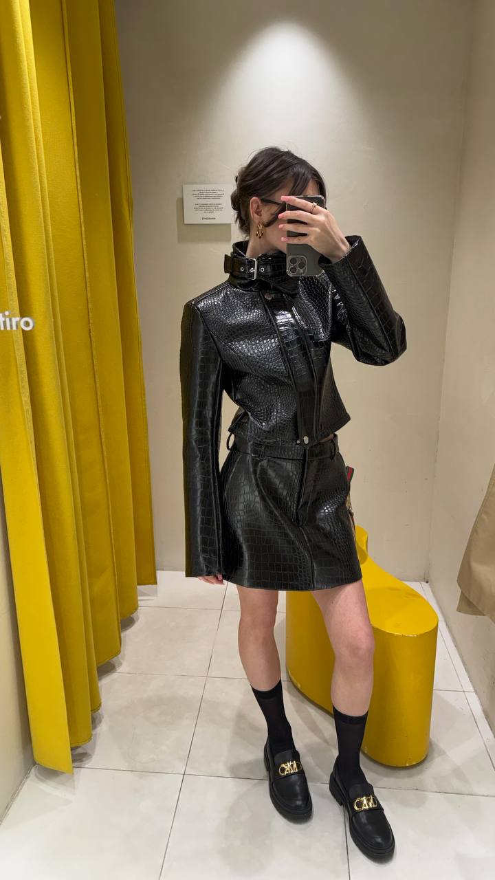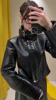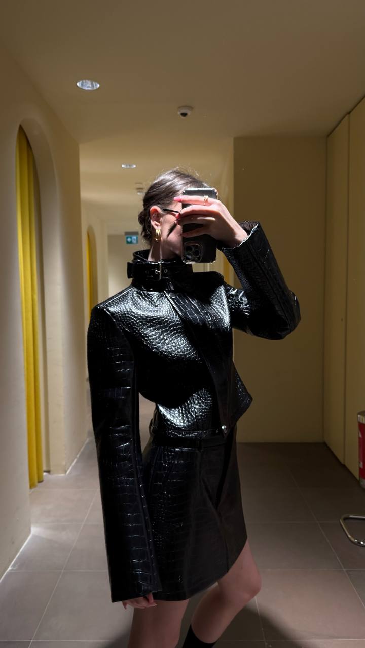 Все с учетом текущих трендом: воротник-стойка, лакированная кожа, принт под крокодила.