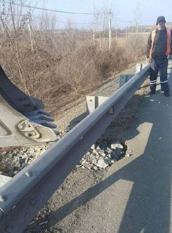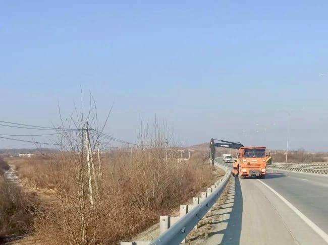 😉Параллельно дорожники очищали катафоты на барьерном ограждении на автодороге Подъезд к Владивостоку