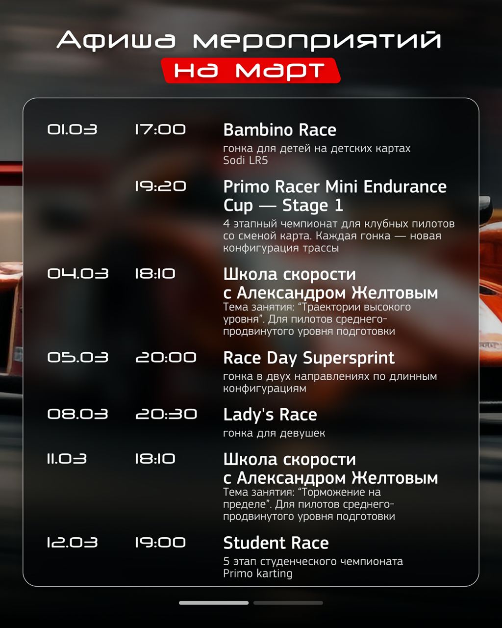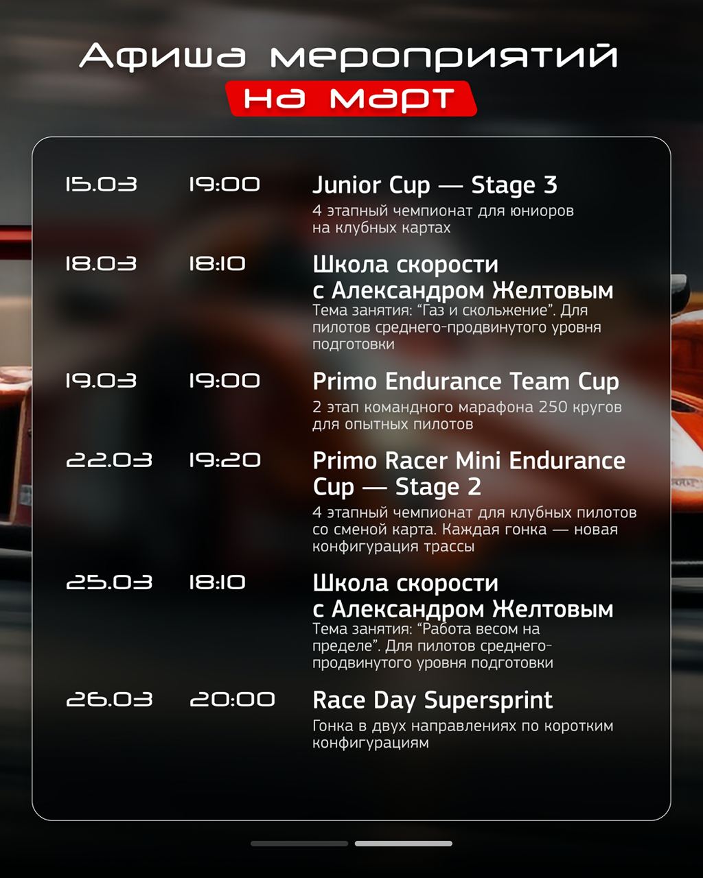 В последние годы сосредоточен на системной работе с гонщиками: техника пилотирования, стабильность темпа, работа с траекторией, анализ ошибок, гоночное мышление и борьба в плотной группе.