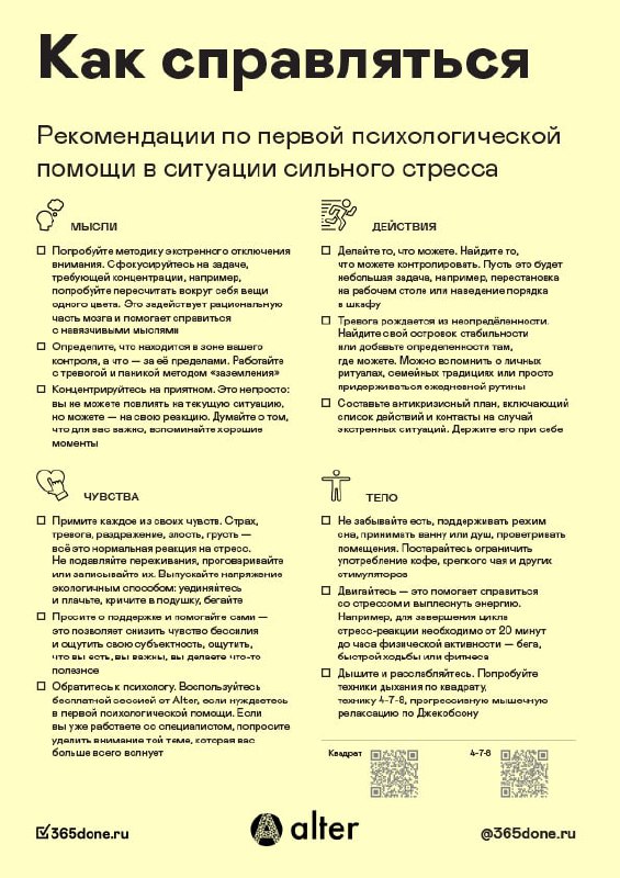 Большой поток тревожных новостей у многих сегодня вызывает сложные переживания. Главное, что мы хотим сказать: всё, что вы сейчас чувствуете — это нормально. Трудно удерживать внутреннее равновесие, когда захватывают паника, страх, беспомощность. Но даже в тяжёлые времена важно не терять возможность почувствовать себя немного лучше.