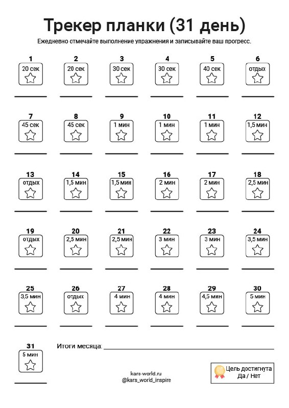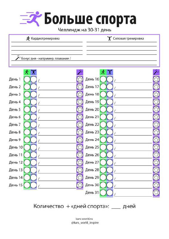 Для вас спортивный челлендж. Выработайте план занятий с учетом кардиотренировок и силовых тренировок. Отмечайте бонус дня — такие занятия, как плавание, ходьба, катание на лыжах или др.