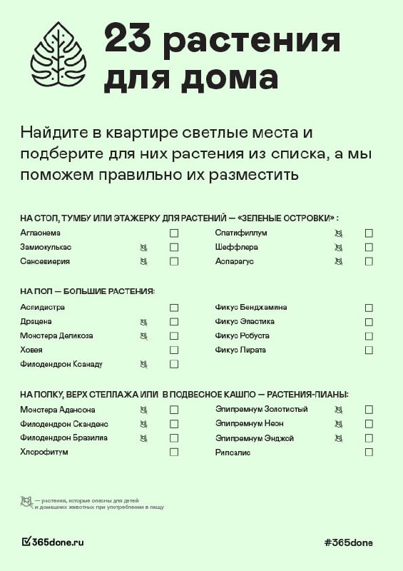 Список комнатных растений, которые будут радовать вас долгой зимой и в облачную погоду. Обратите внимание на иконки о домашних животных.