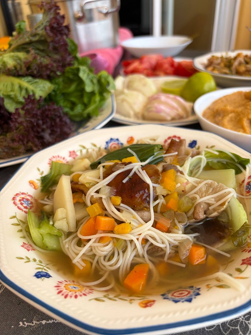 За 2-3 минуты до окончания готовки - рисовую лапшу и листья пак-чой.