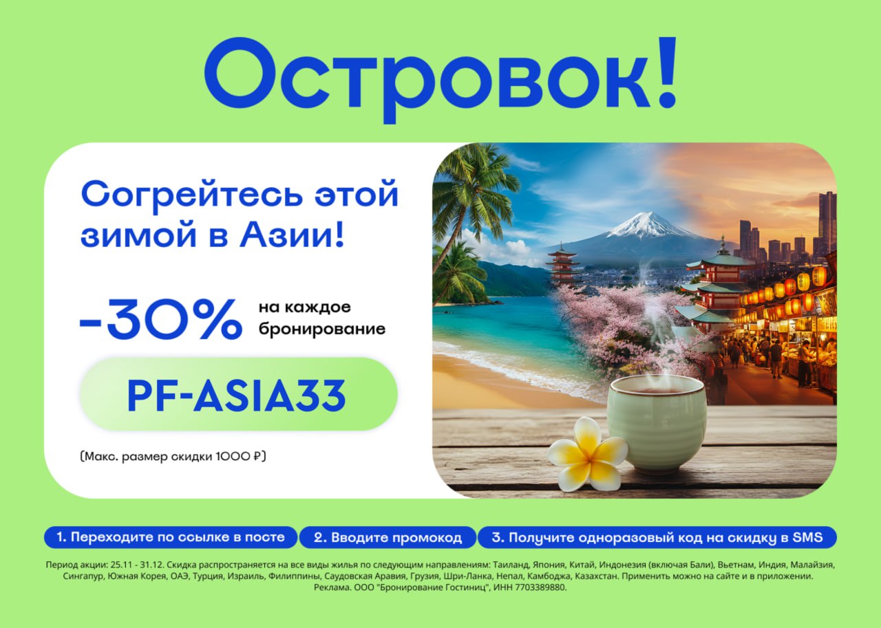 🔥 PF-ASIA33 - Скидка 30% на каждое бронирование жилья по определённым направлениям* (но не более 1 000 ₽).
