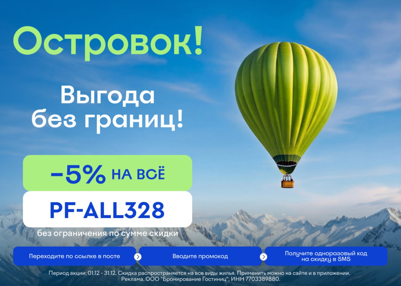 ⭐️ PF-ALL328 - скидка 5% на все виды жилья на каждое бронирование (без ограничений по сумме).