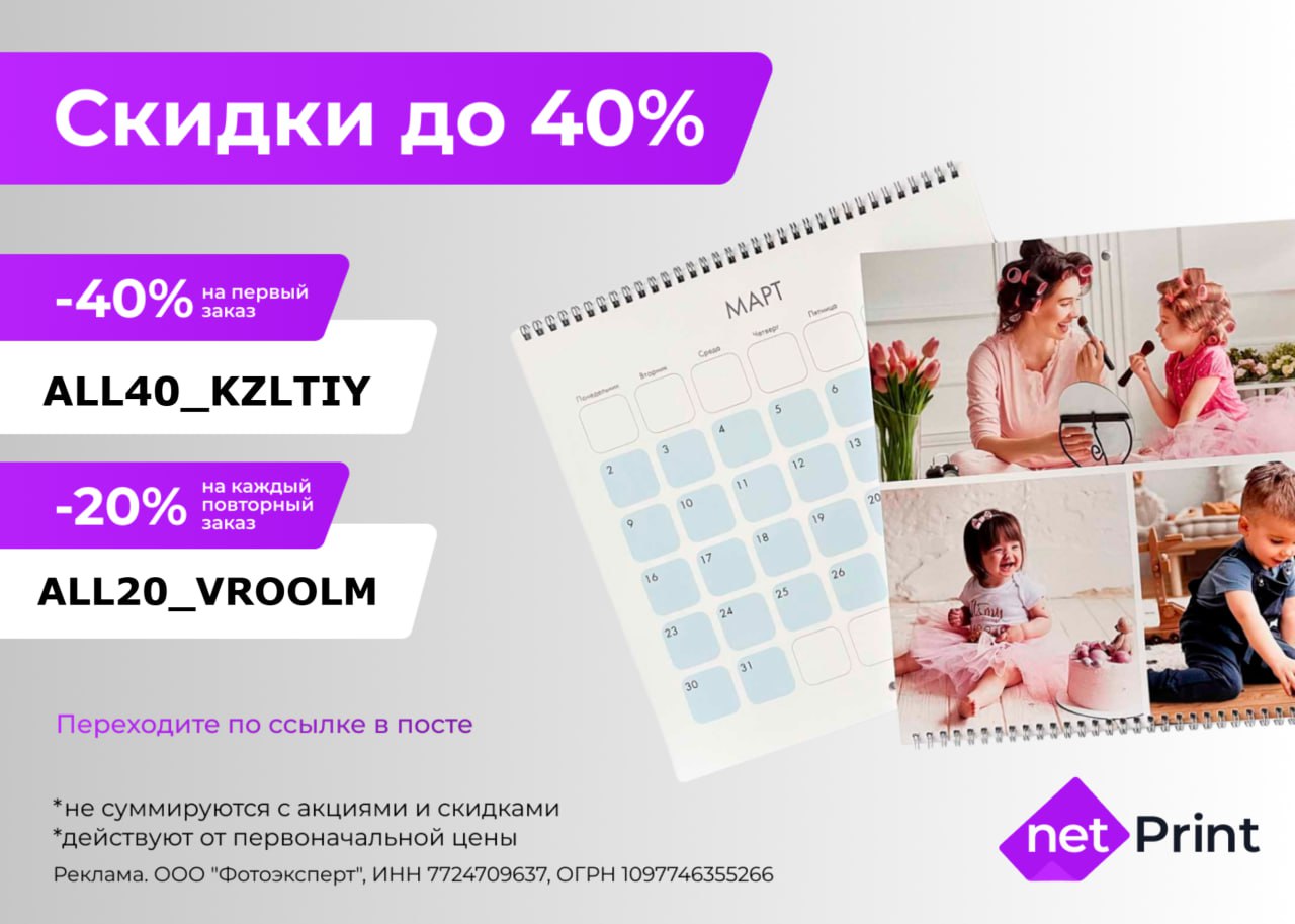 Создайте фотокнигу ваших общих моментов, персонализированный календарь или даже стильный портрет! Воспользуйтесь промокодами: