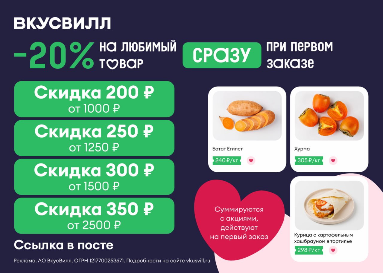 Переходите по ссылке👈 и используйте один из промокодов на первый или повторный заказ (возможно однократное применение):