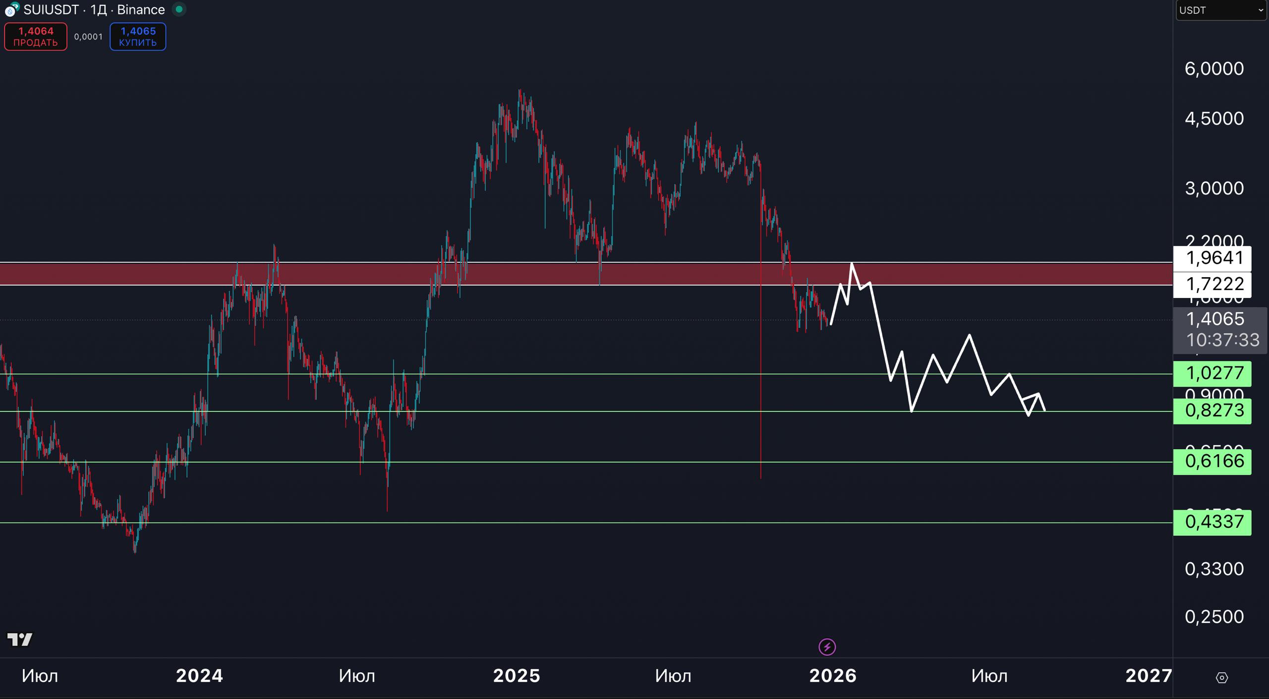 Соответственно, вероятность продолжения снижения в первой половине 2026 года высокая. Уровни которые обозначены зеленым цветом, являются важными поддержками во время теста которых можно рассматривать SUI к накоплению.