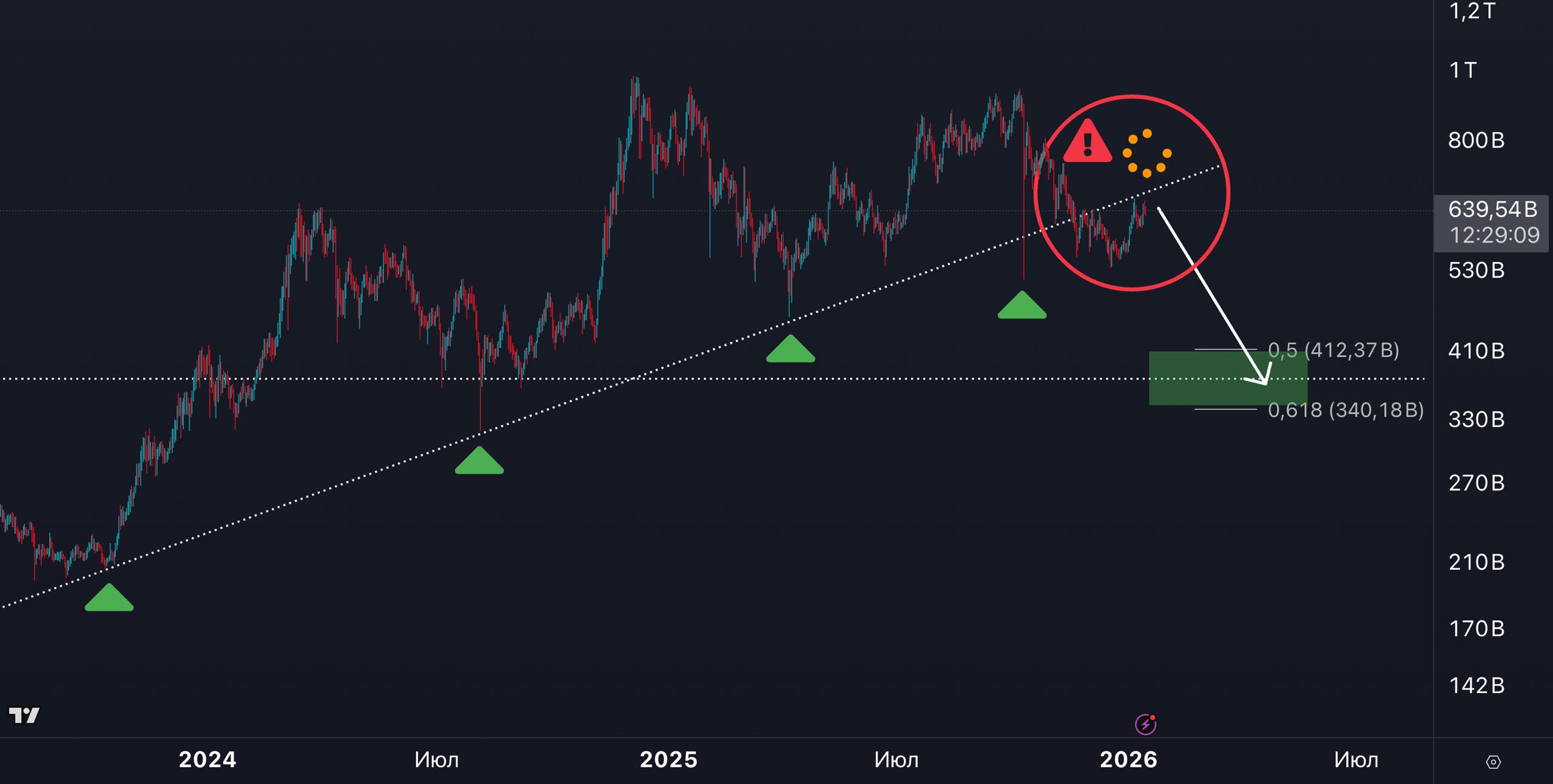 ⚠️ По капитализации альткоинов тестируем пробитую трендовую линию поддержки.