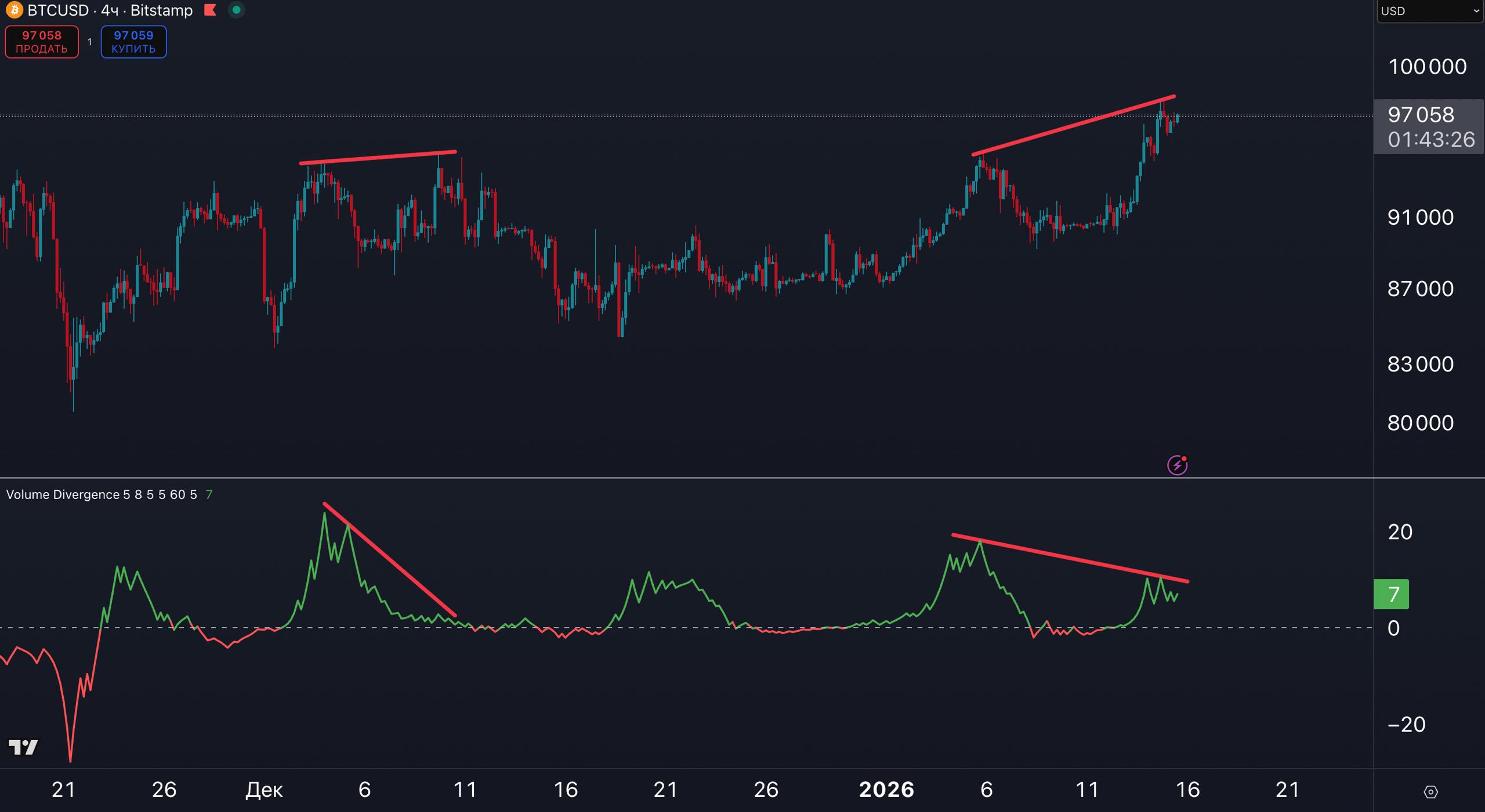 🔴 По Volume Divergence H4 наблюдаем медвежью дивергенцию, что указывает на слабость локального бычьего тренда.