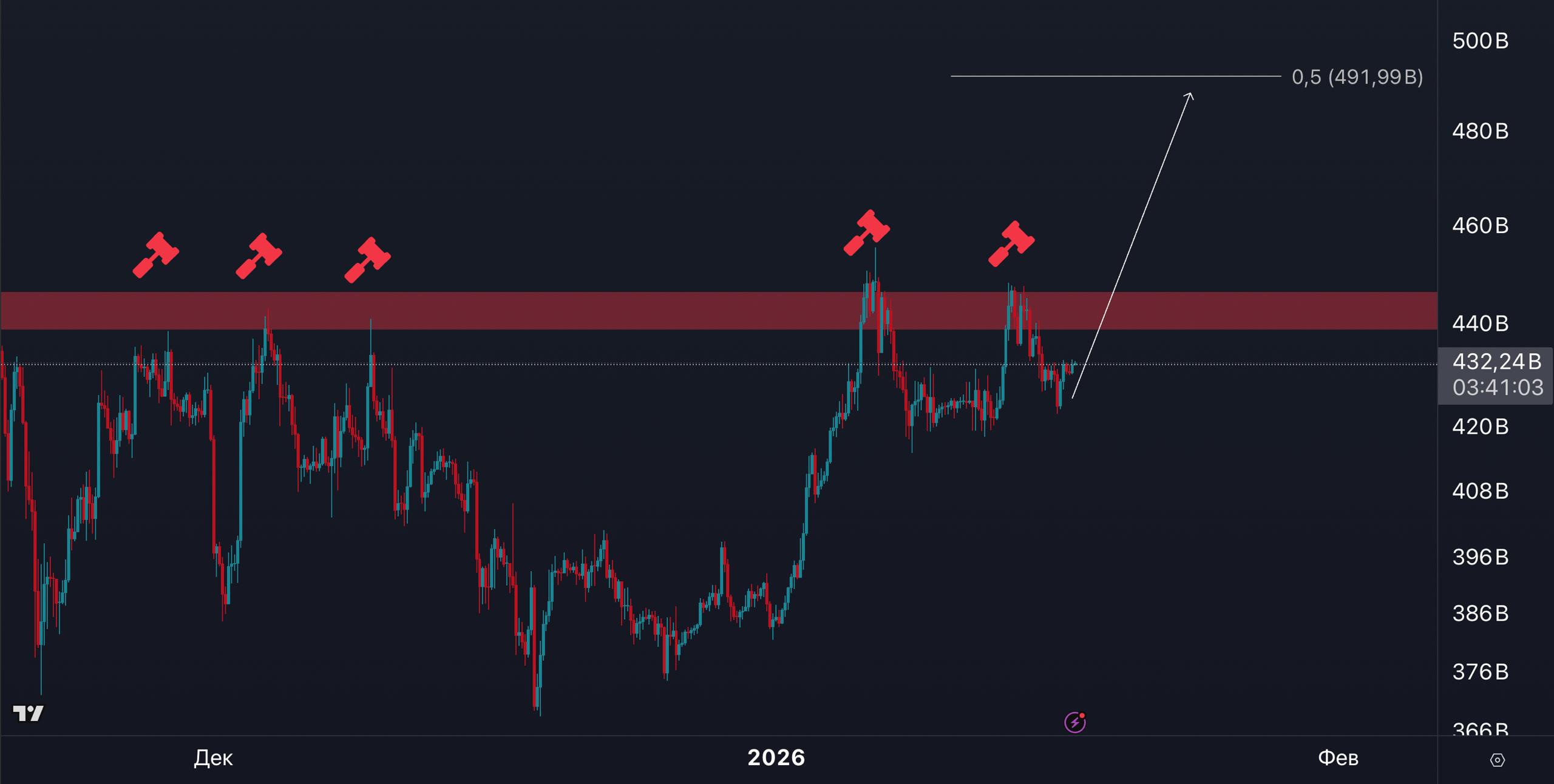 Если в ближайшие 2 недели нам не удастся вернуться выше неё, начнётся реализация изображенного на графике сценария👀