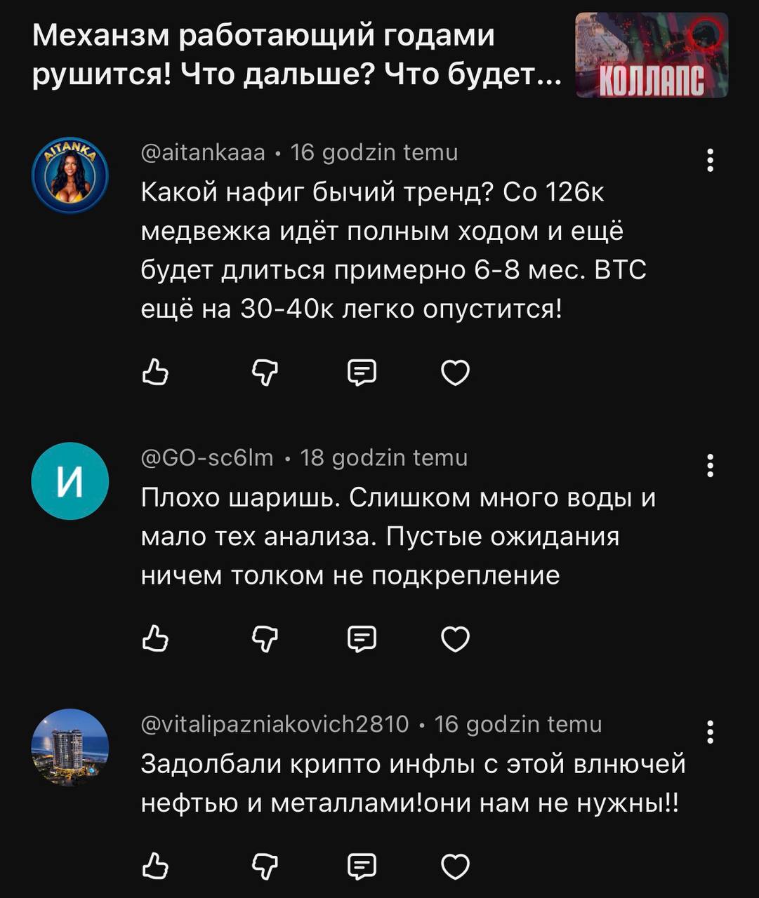 Просто, с юмором и без цензуры показываю изнанку крипты. Предвидел глобальный дамп, который мы наблюдаем сейчас, когда все кричали о его неминуемом росте и альт сезоне. Торгую уже много лет, а теперь ещё и учу вас, как не потерять деньги на эмоциях, а заработать благодаря верному подходу.
