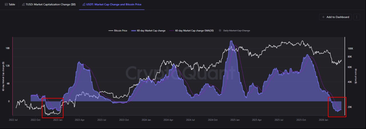 Капитализация USDT не растёт. Когда подобное происходит после падения / затяжной коррекции, это бычий сигнал.