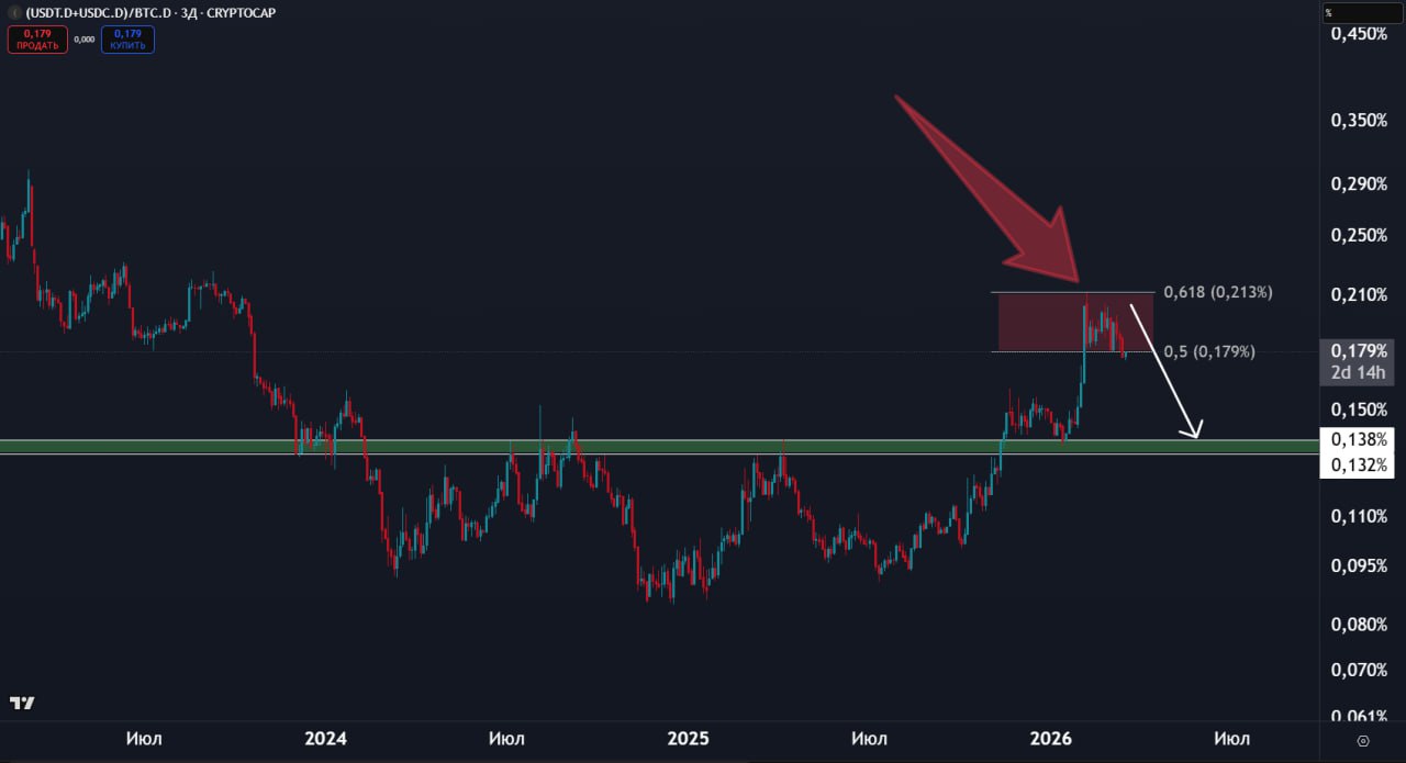 Мы не сумели закрепиться выше красного блока. Это означает, что ликвидность будет уходить из стейблкоинов в BTC в ближайшие 4-6 месяцев.