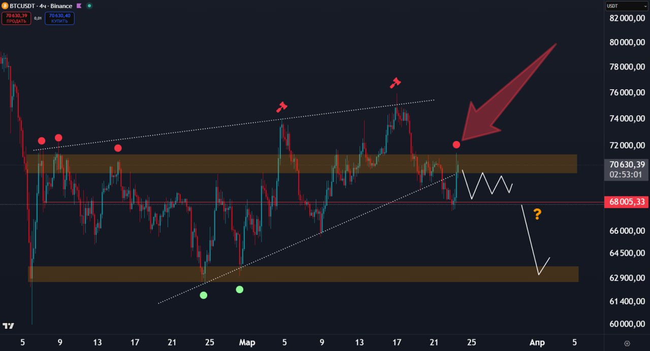 Поэтому, если сегодняшний день закроется ниже показанных на графике сопротивлений, логично ожидать снижение на протяжении всей недели. Это может потянуть за собой крипту.
