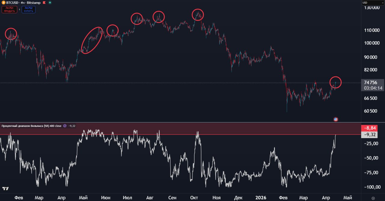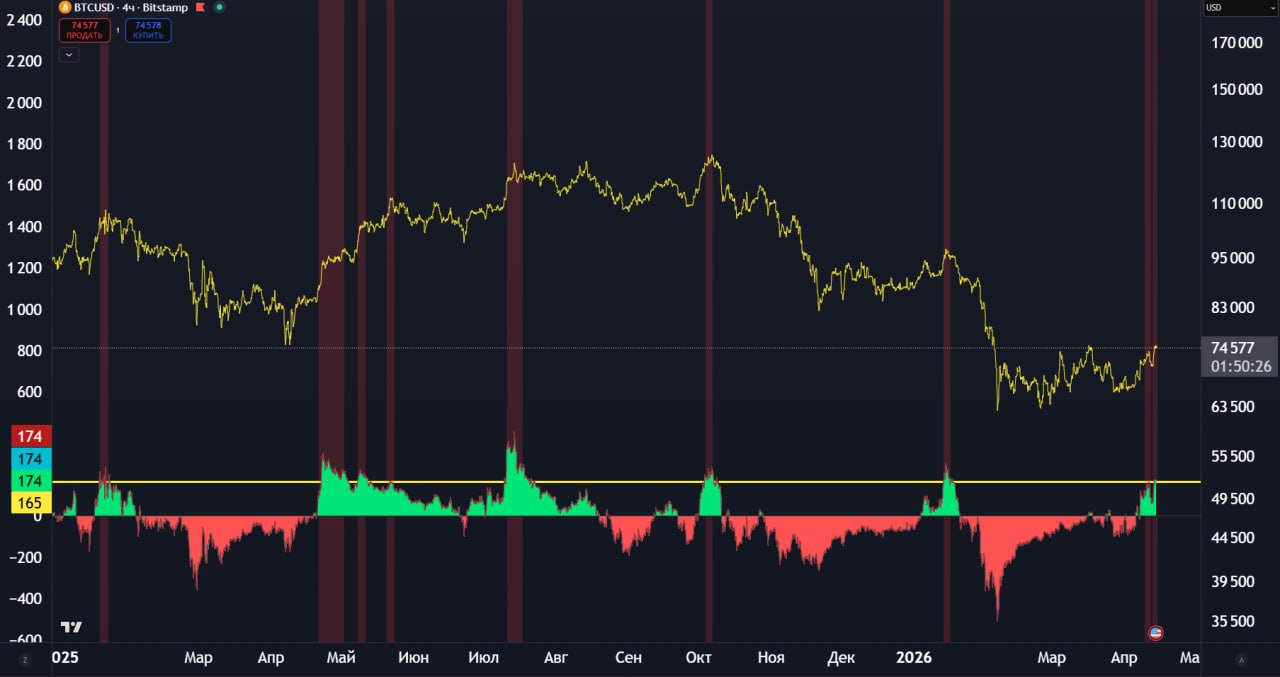 По True Trend BTC на Н4 тф наблюдаем сигнал на снижение. Лишь в редких случаях локального дампа не было.