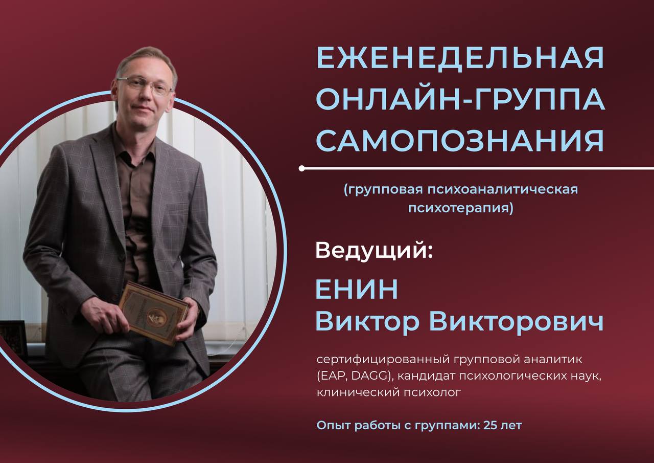 Откройте для себя возможности личностного роста и глубокого самопознания! 🔹Приглашаю вас в терапевтическую группу, где в поддерживающей атмосфере вы сможете исследовать себя и свои отношения с миром. Доступна онлайн-группа: ✨Новая группа: Среда, 19:00 - 20:30 (мск) Что вас ждет? Групповая психотерапия – это мощный инструмент для понимания себя и улучшения качества жизни. В группе, под чутким руководством опытного специалиста, вы сможете: • Разобраться в глубинных причинах своих проблем. • Научиться строить более здоровые и гармоничные отношения. • Проработать внутренние конфликты и травмы. • Получить поддержку и понимание от других участников. • Пережить широкий спектр эмоций в безопасной обстановке. ❗️Важные детали: • Размер группы: 6-12 человек. • Ключевой принцип: Открытое и честное выражение своих мыслей и чувств. 💳Стоимость: 3.000 рублей за встречу (пропущенные встречи оплачиваются). 📌Ведущий: Виктор Викторович Енин – высококвалифицированный психотерапевт с 25-летним опытом работы с группами, паст-президент Ассоциации развития психотерапии и психоанализа, сертифицированный групповой аналитик, кандидат психологических наук и заведующий кафедрой клинической психологии. Начните свой путь к себе! ❇️Чтобы узнать больше и записаться на бесплатную предварительную консультацию, свяжитесь по номеру: 📲+7-928-304-21-13 (WhatsApp, Telegram).