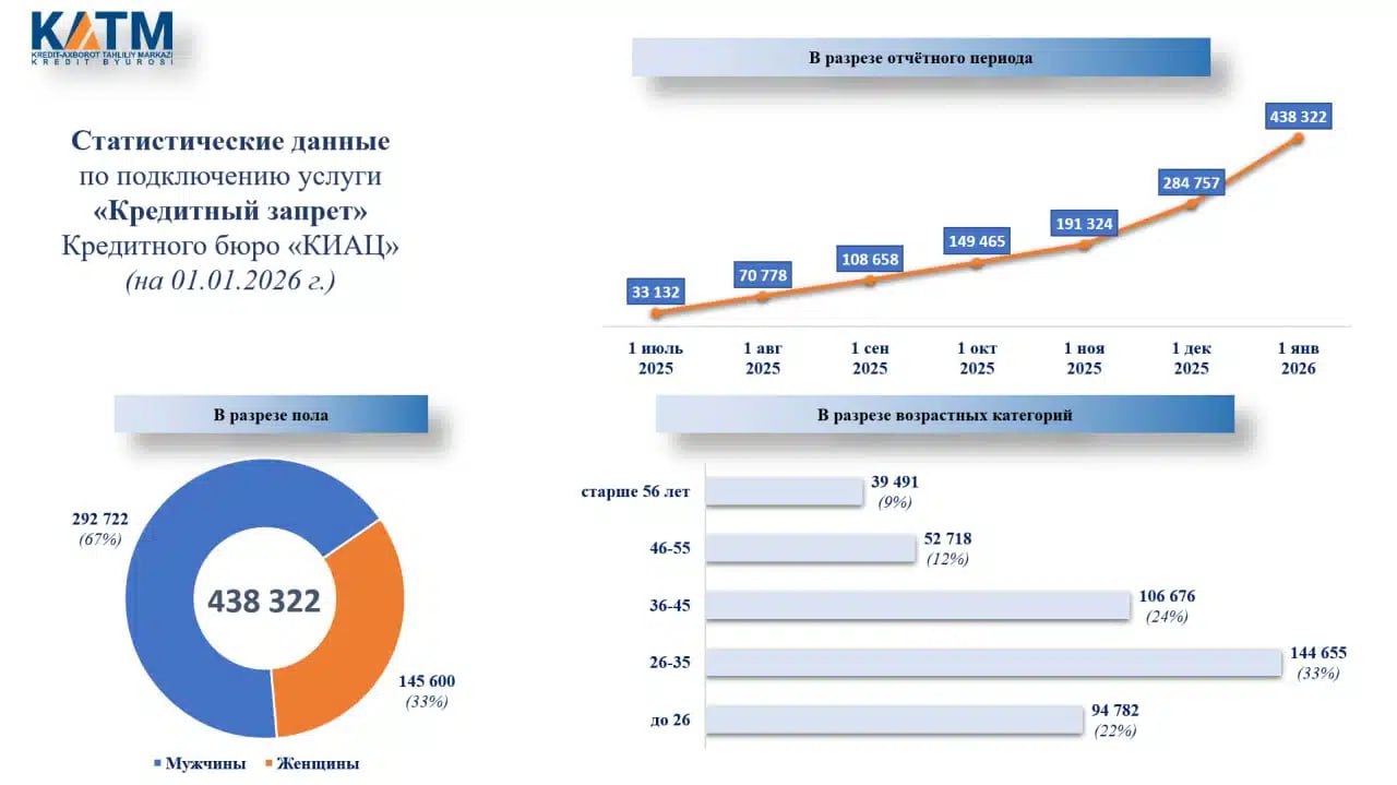 KIACl statistik ma’lumotlariga ko‘ra, 2025-yilda kredit olishga o‘z-o‘zini taqiqlash xizmatini 438,3 mingdan ortiq fuqaro yoqqan. Taqqoslash uchun: o‘tgan yil 1-dekabr holatiga ko‘ra bu xizmatdan 284,7 ming kishi foydalangan.