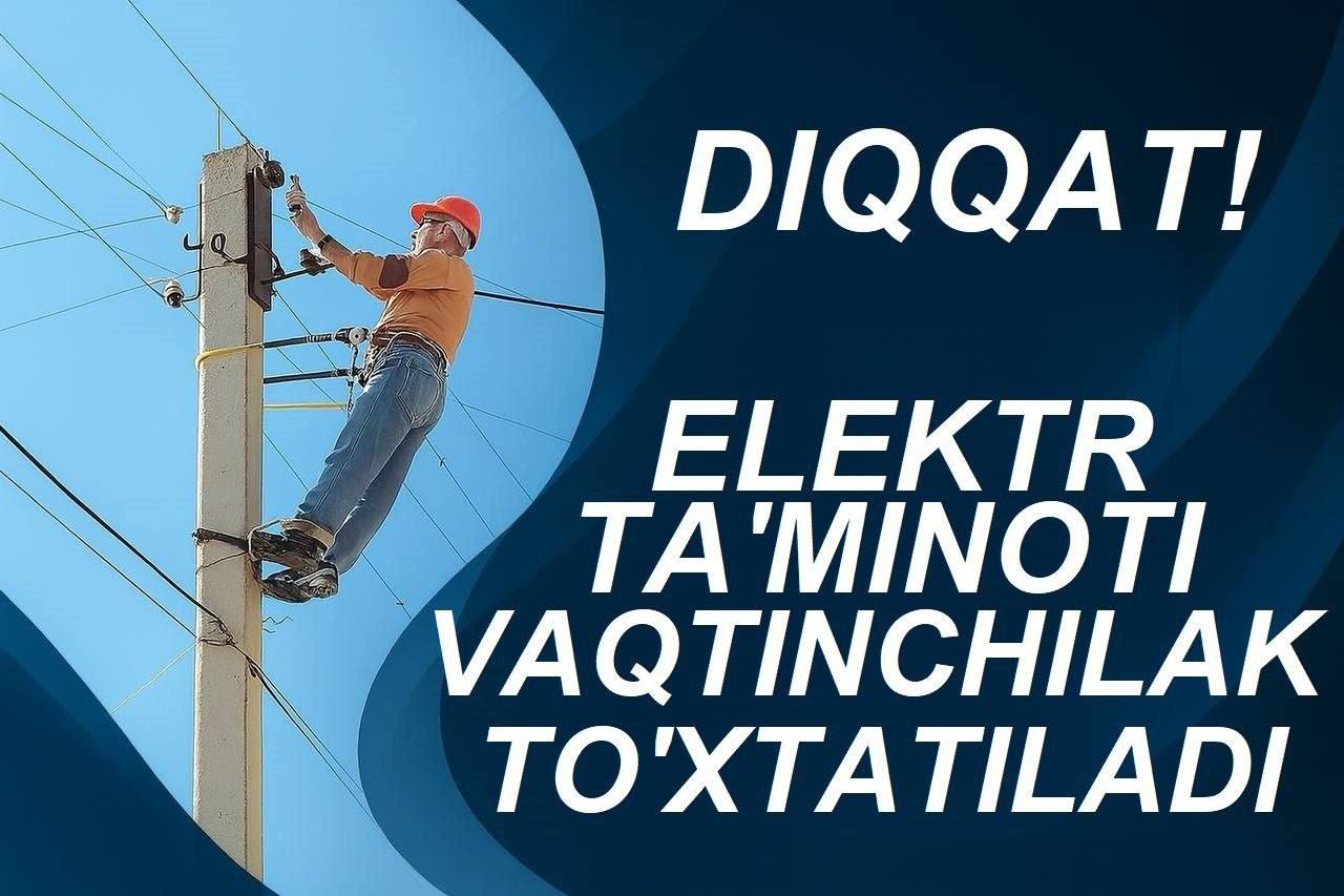 Uzilishlar quyidagi mahallalarning ayrim hududlarida bo‘ladi: Sa’diy Sheroziy, Guliston, Gulchorbog‘, Dilkusho, Gulshan va Olim Xo‘jayev — soat 09:00 dan 18:00 gacha.
