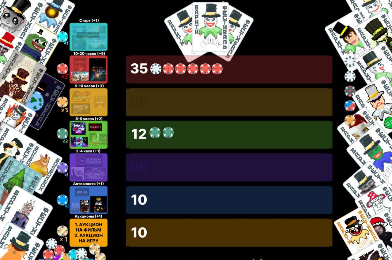 Фидбек по поводу бессмысленно сложной системы самого фестиваля понимаю и принимаю, в следующий раз постараюсь сделать проще и зрелищнее, но в целом я и от этого теребления фишек кайфанул, мне было весело!