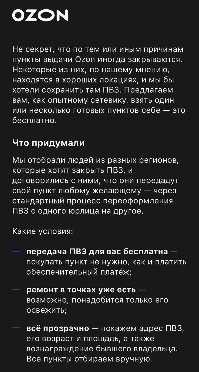 В Ozon поясняют, что многие такие ПВЗ расположены в удачных местах, но в текущих условиях работают с убытками. Их решили отдавать другим партнёрам — прежде всего тем, у кого уже есть сеть пунктов и необходимые ресурсы, чтобы сделать точки прибыльными.